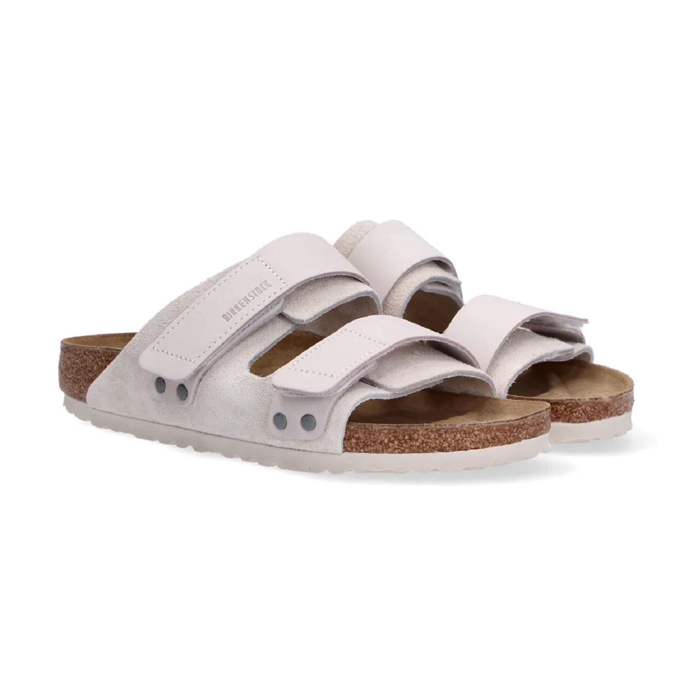 Sandalo donna BIRKENSTOCK. Modello Uji con doppia fibbia chiusura strap. In pelle nabuck e pelle lucida.