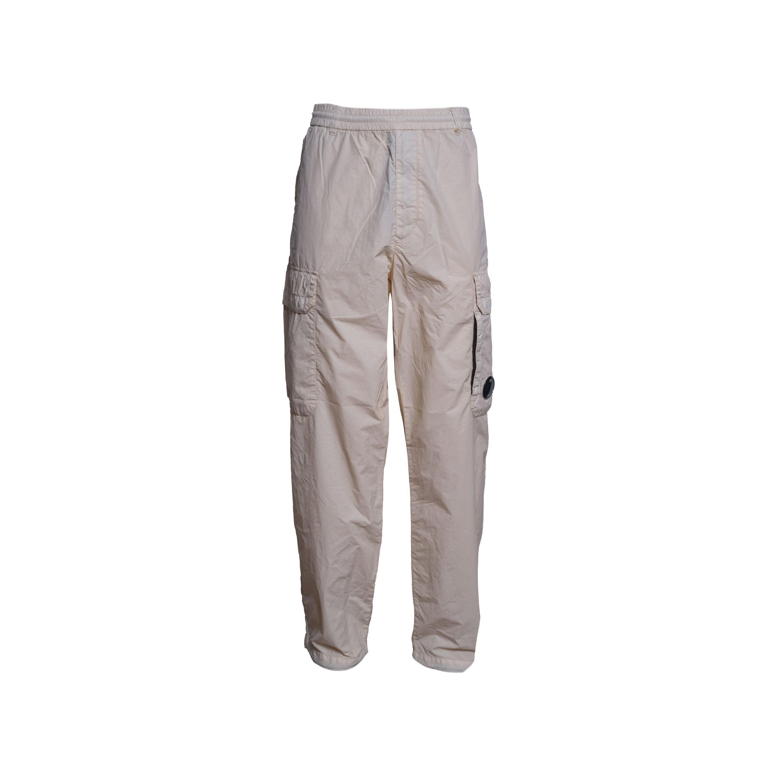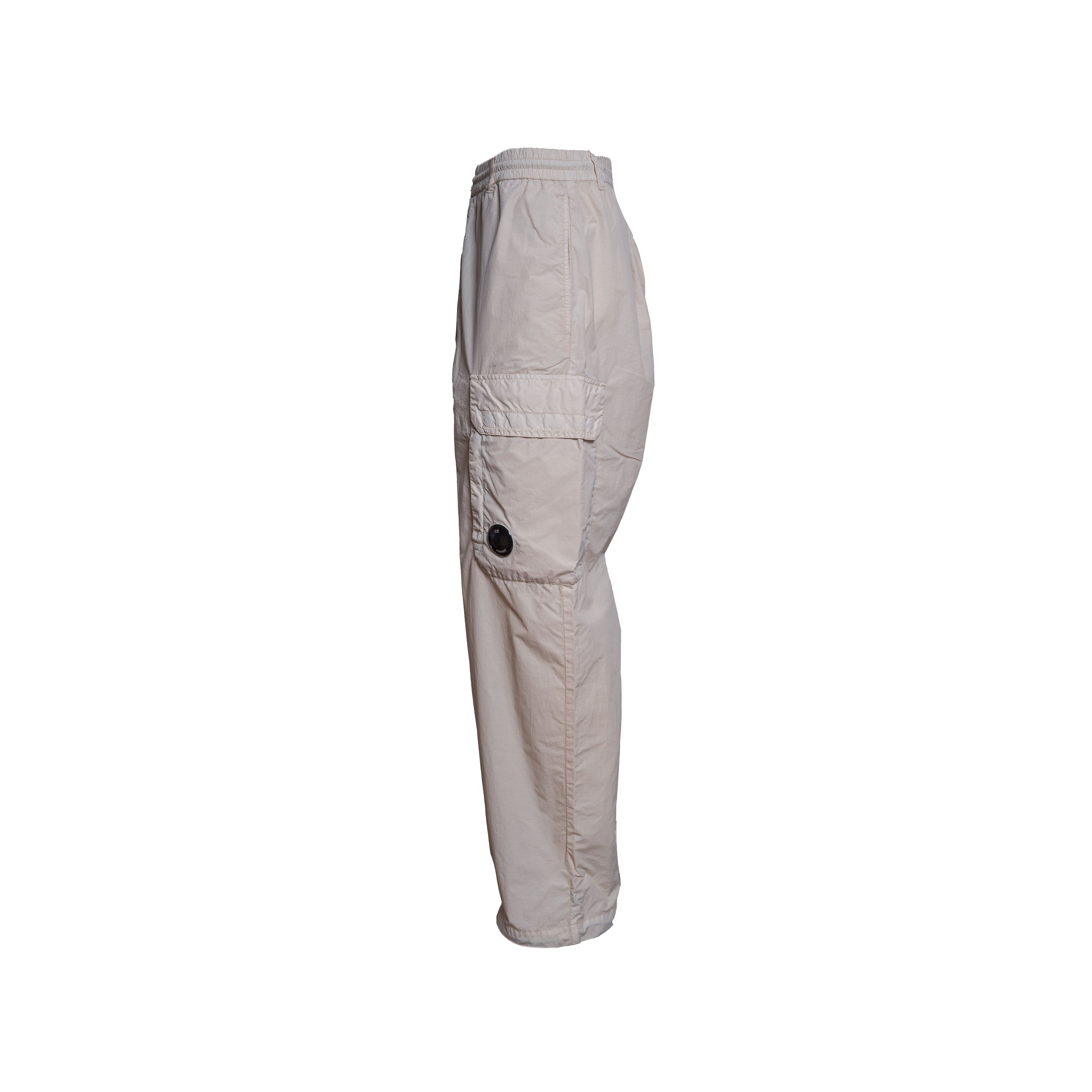 Pantalone da uomo C.P. COMPANY. Modello cargo con tascone laterale applicato e l'iconica lente C.P. COMPANY, coulisse in vita con passanti, chiusura con bottone e zip, tasca singola posteriore a patta con bottone automatico, orlo regolabile con coulisse per una vestibilità personalizzabile. Realizzati in Flatt Nylon, un nylon opaco smerigliato con una leggera resinatura sul rovescio. Tinti in capo, trattati anti-goccia. Loose fit. Made in Italy.