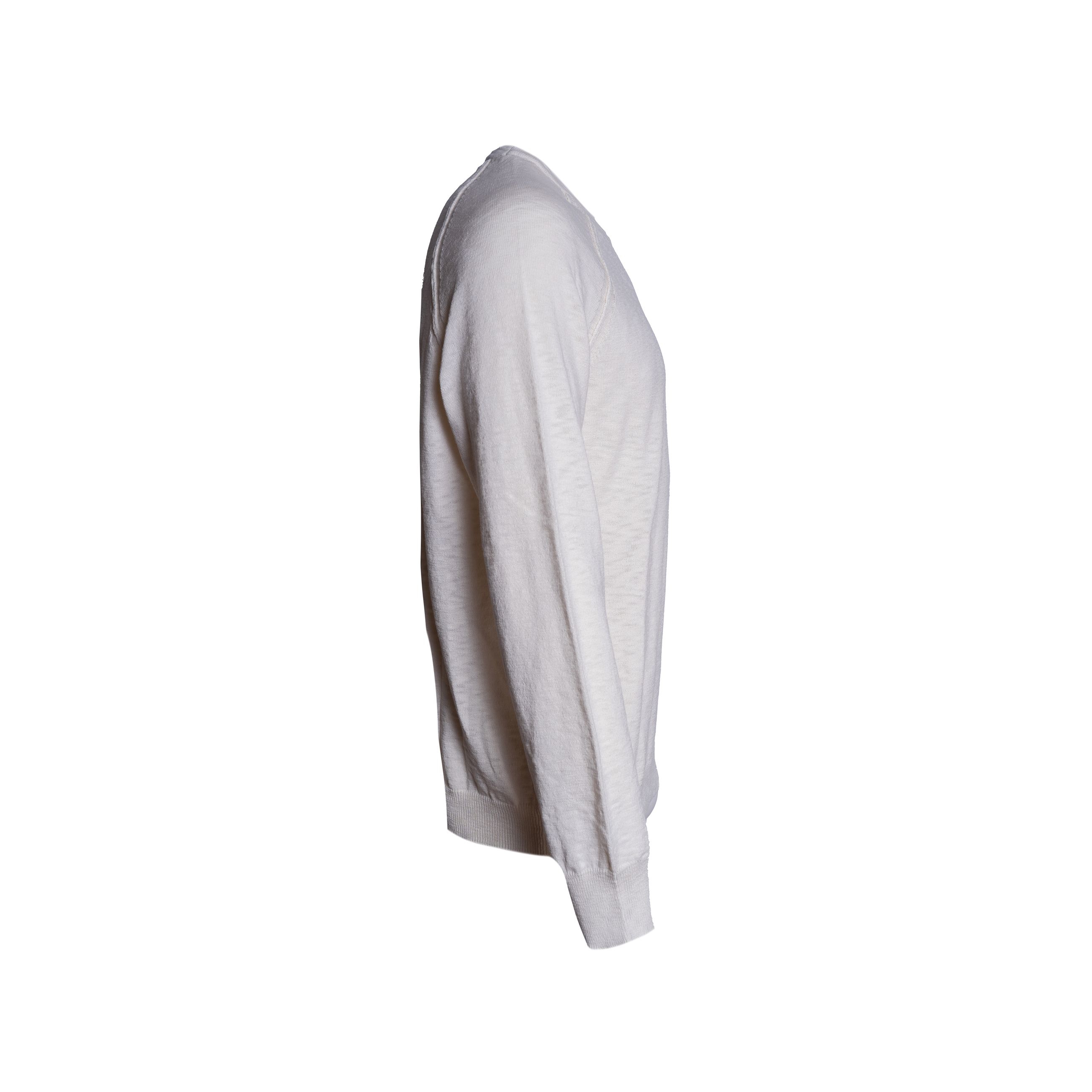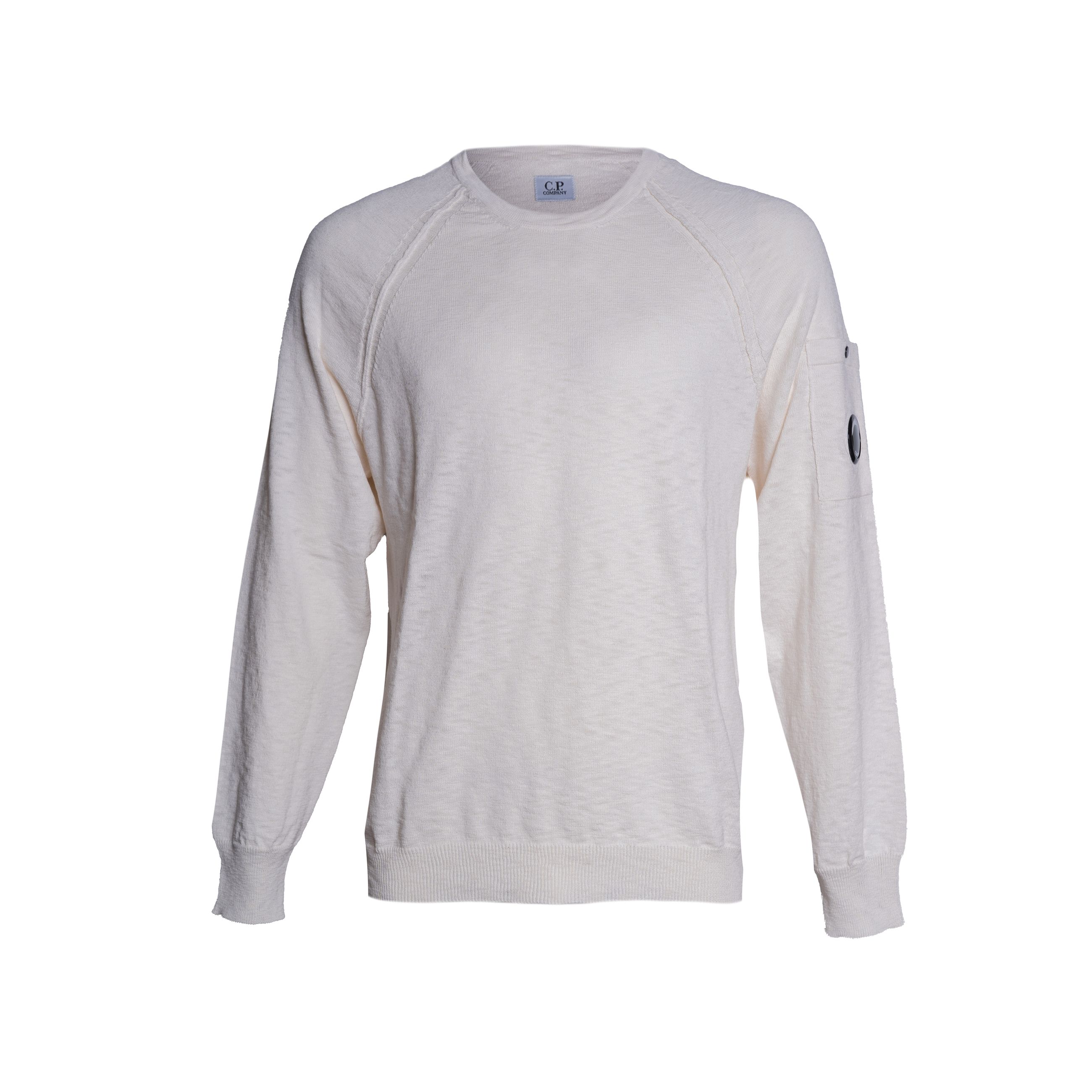 Maglione da uomo C.P. COMPANY. Modello girocollo manica lunga realizzato in cotone fiammato, un tessuto leggero e traspirante caratterizzato da una texture naturalmente irregolare. Il modello presenta un girocollo a costine e cuciture in rilievo contrasto sulle. Completano il design il taschino con l’iconica Lente di C.P. Company sulla manica e polsini e orlo a costine per una vestibilità strutturata e confortevole. Finezza 14. Regular fit. Made in Italy.