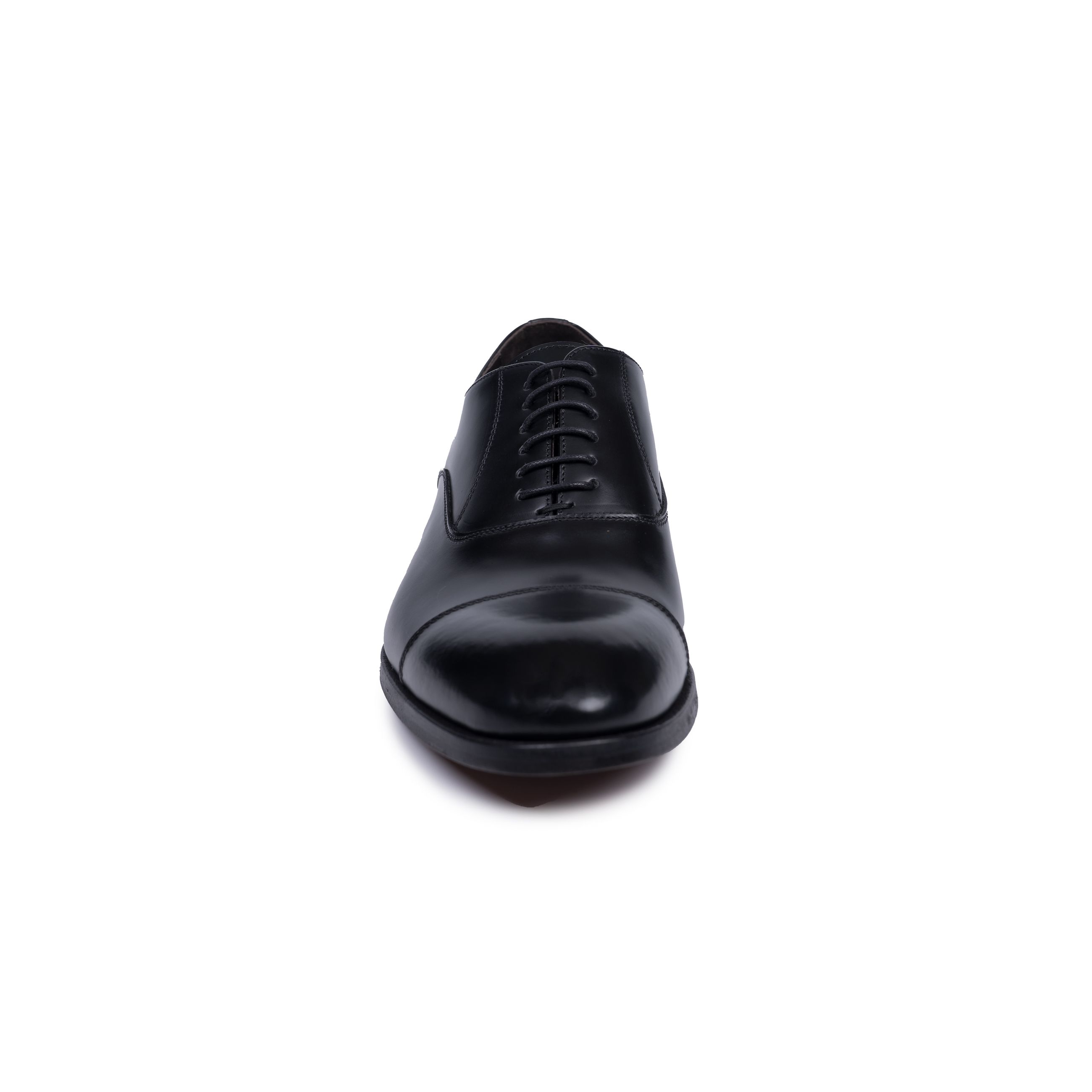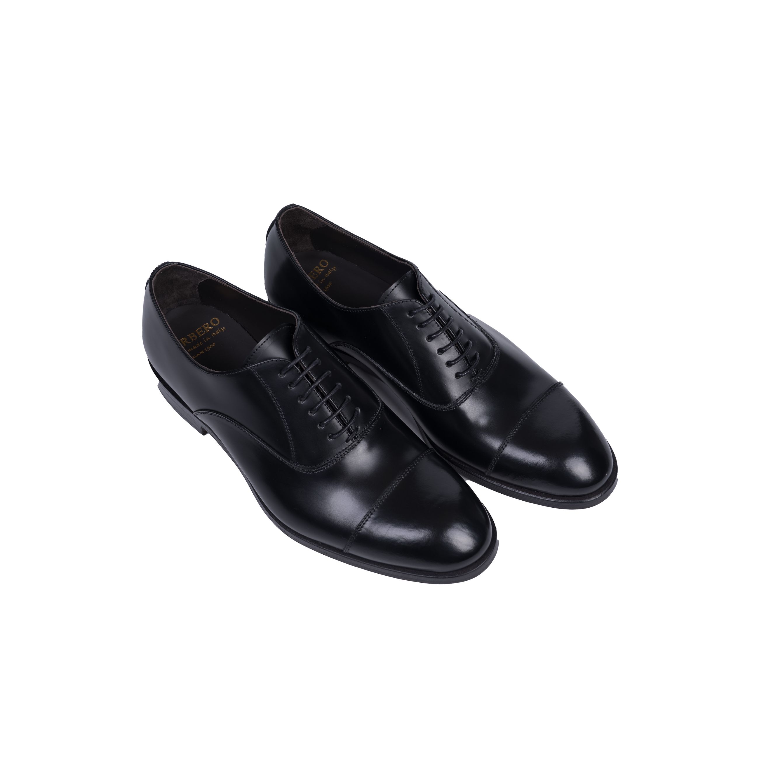 Scarpa da uomo CERBERO. Modello francesina allacciata con puntale caratterizzata da cucitura a vista, realizzata in pelle lucida, fondo in cuoio cucito.