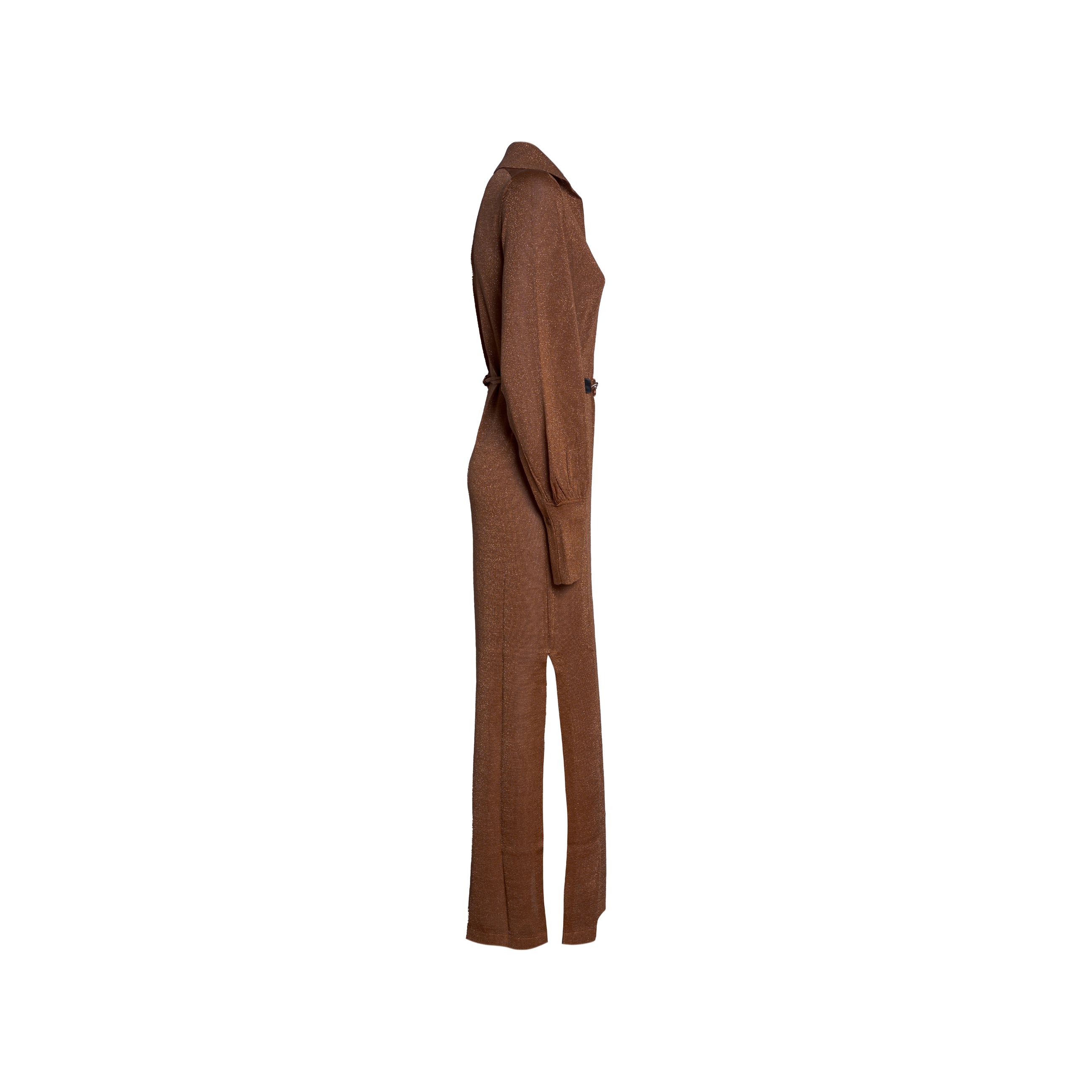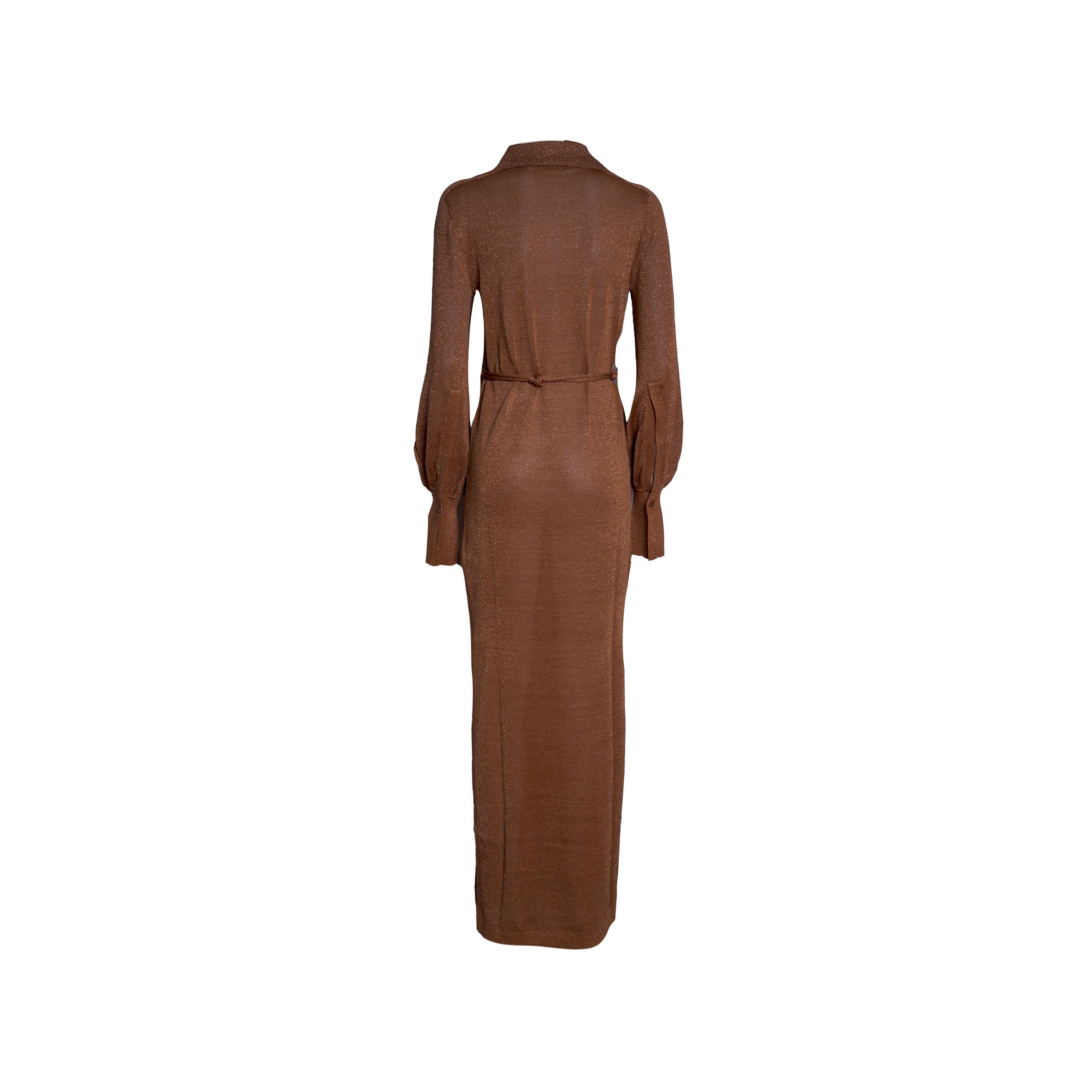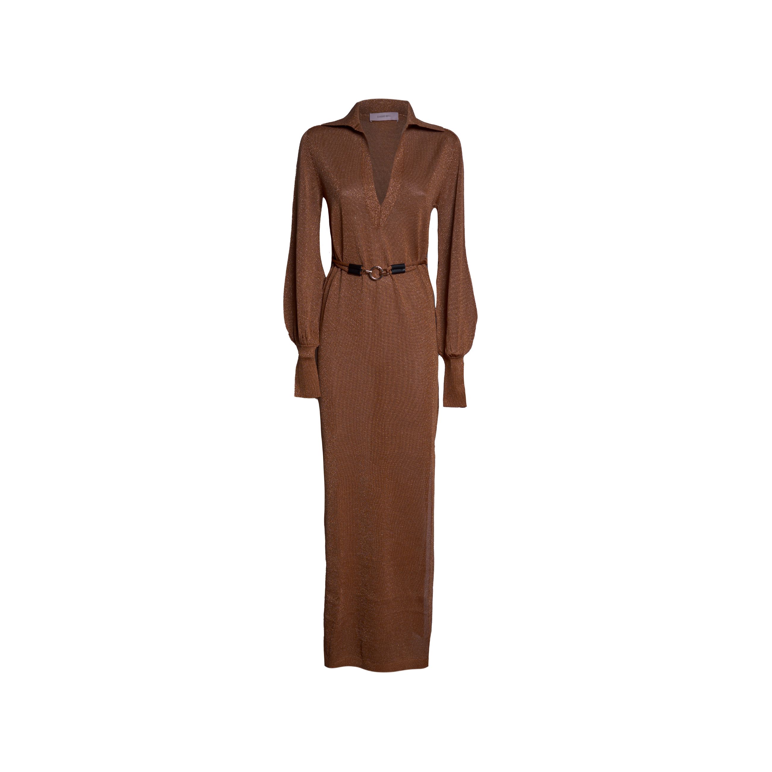 Abito da donna CIRCUS HOTEL. Modello chemisier lungo con colletto a polo senza bottoni, manica lunga con polsino alto e bottoni che danno un effetto a palloncino alla manica, cintura in vita con passanti. Realizzato in viscosa nell'iconico tessuto laminato. Made in Italy.