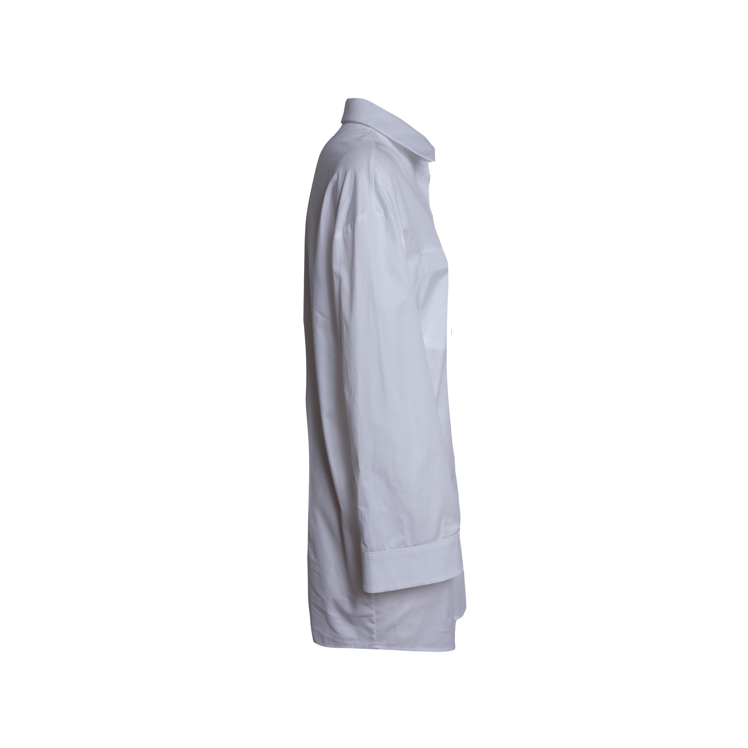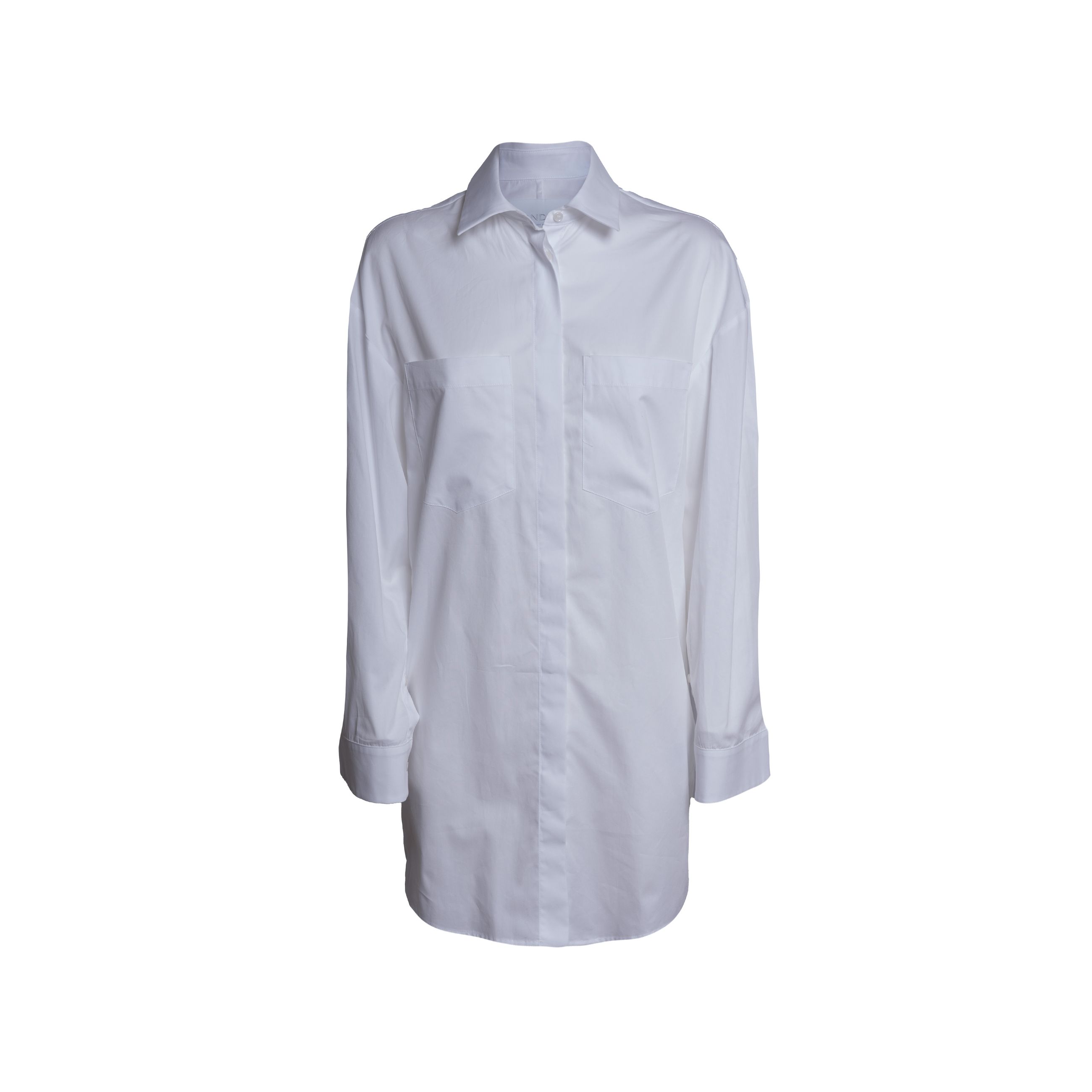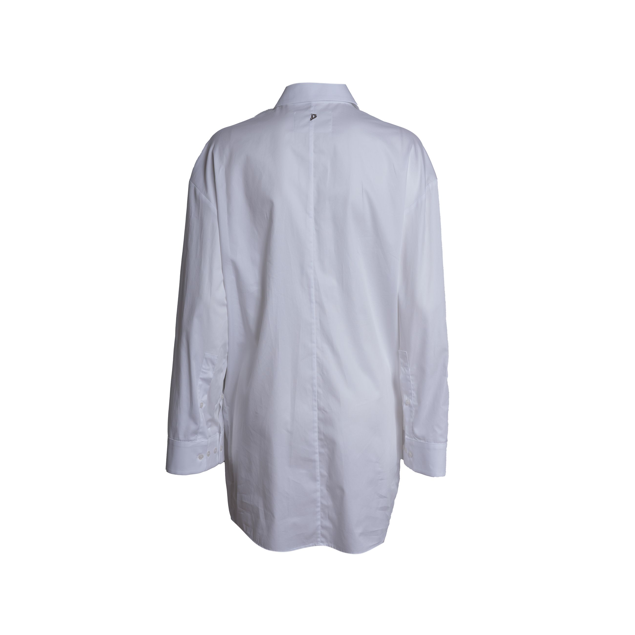 Abito da donna DONDUP. Modello a camicia con maniche svasate ampie, colletto classico, abbottonatura coperta e tasche frontali applicate sul petto realizzata in popeline di fresco cotone. Minigonna asimmetrica realizzata in lana vergine con profilatura in raso, cerniera laterale, da sovrapporre alla maxi camicia. Vestibilità regular. Made in Italy