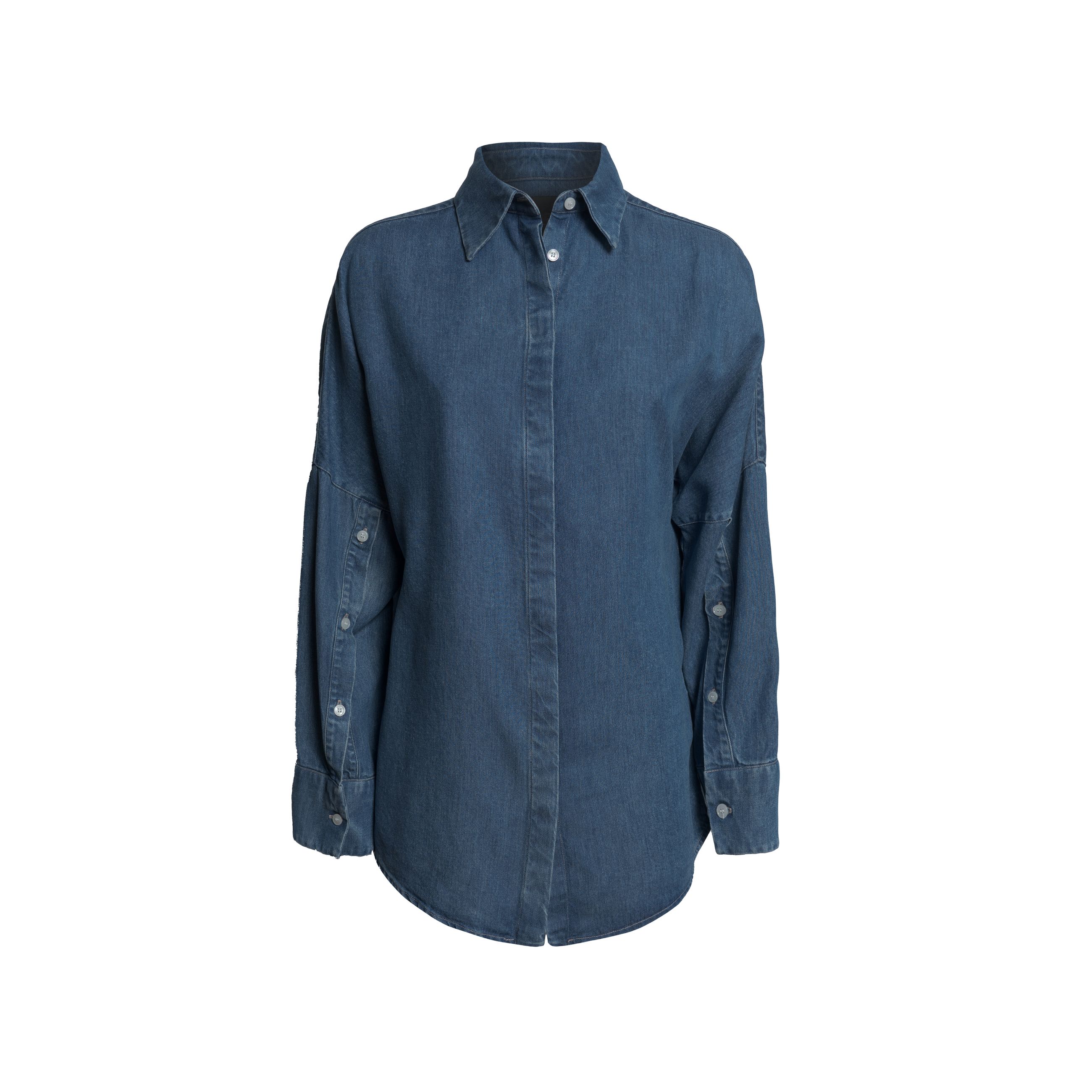 Camicia da donna DONDUP. Modello over e lungo con abbottonatura coperta, colletto a camicia, maniche lunghe con bottoni lungo la cucitura, vestibilità morbida con spalla scesa e fondo leggermente arrotondato. Realizzata in denim leggero e morbido.