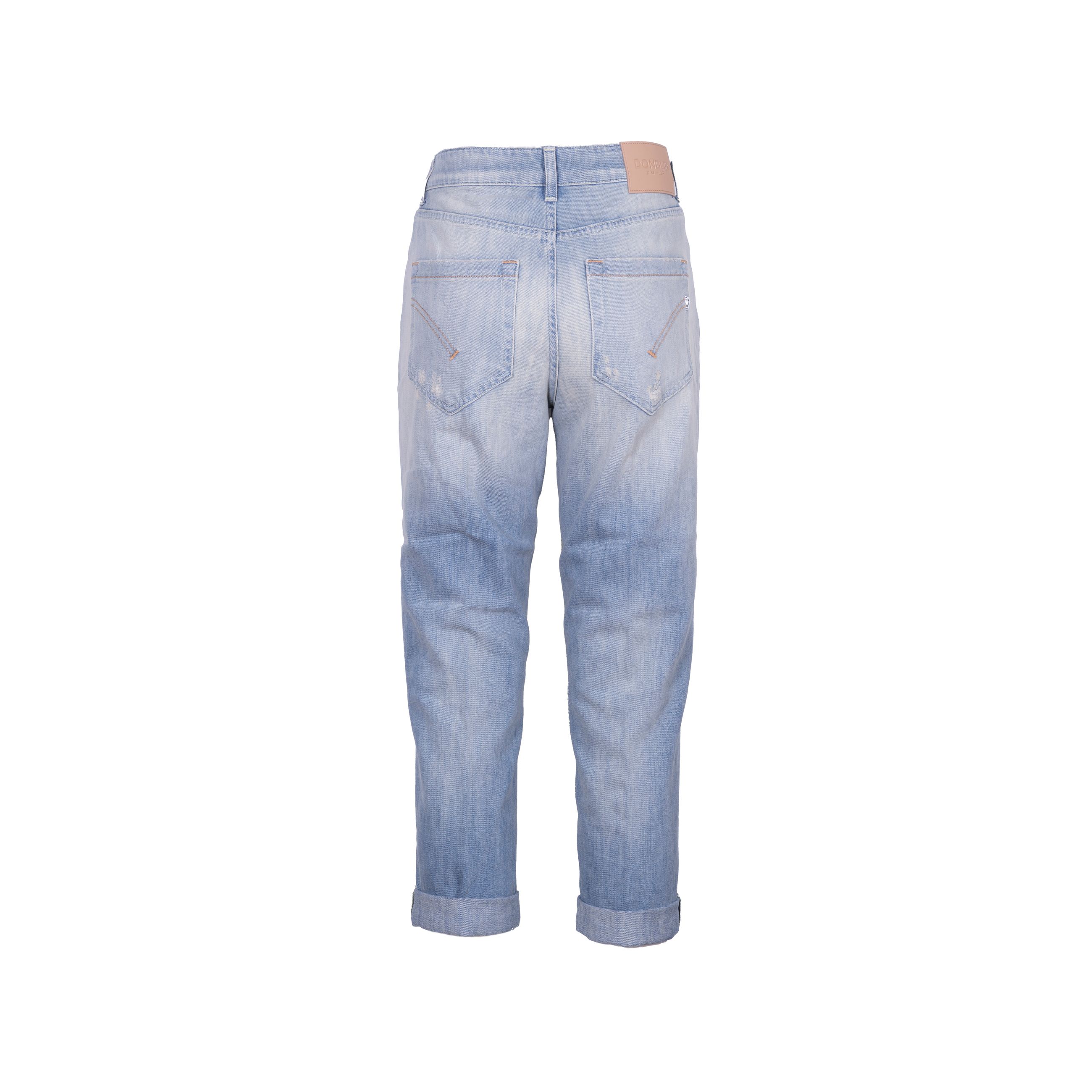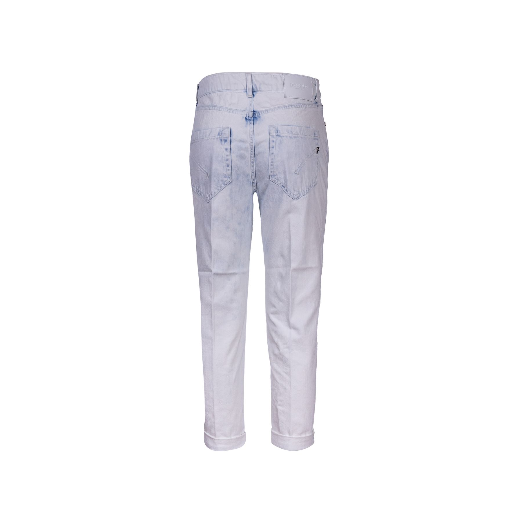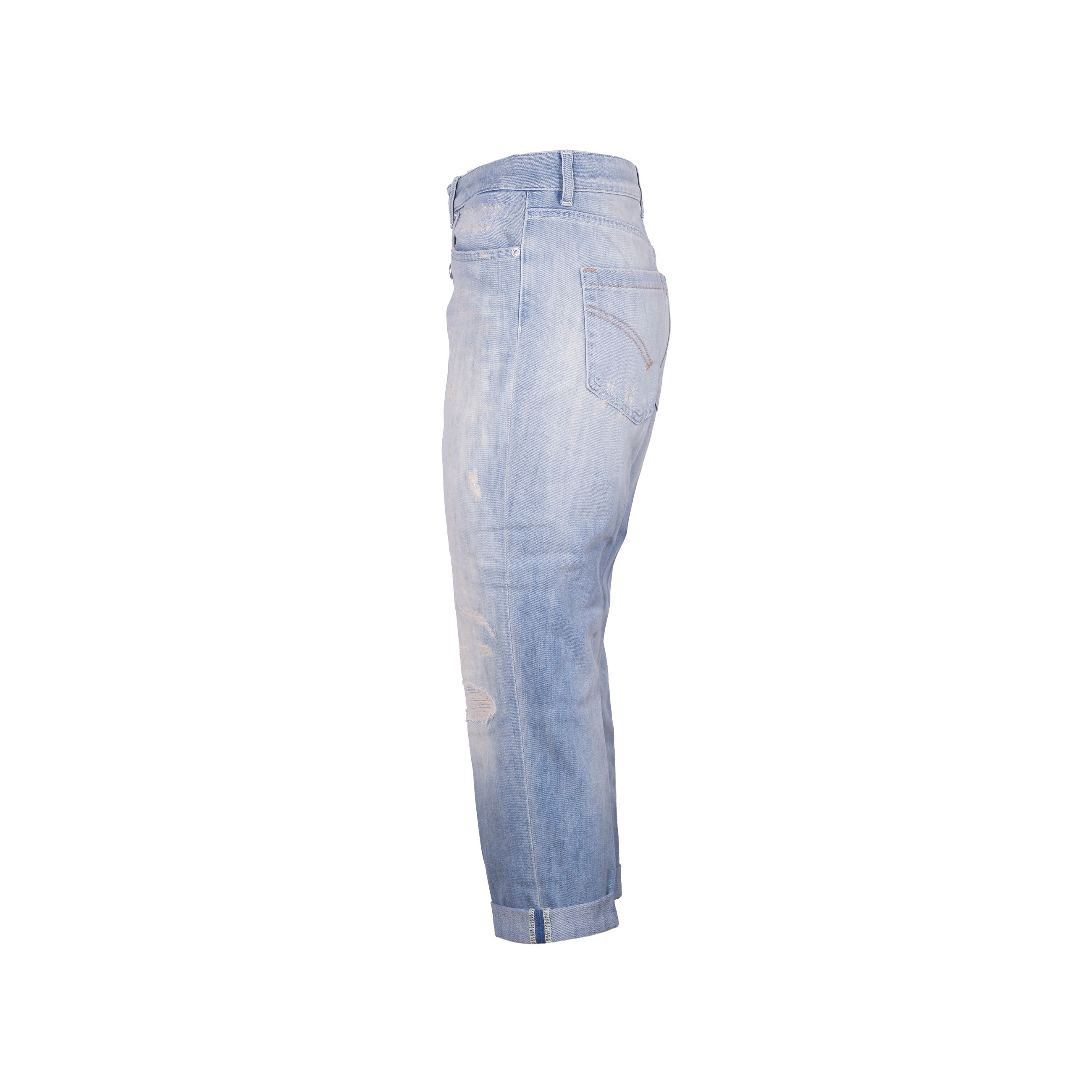 Denim Koons da donna DONDUP. Modello dalla vestibilità Loose, cavallo basso, fondo stretto e corto. Dettaglio bottone e applicazioni gioiello. Made in Italy.