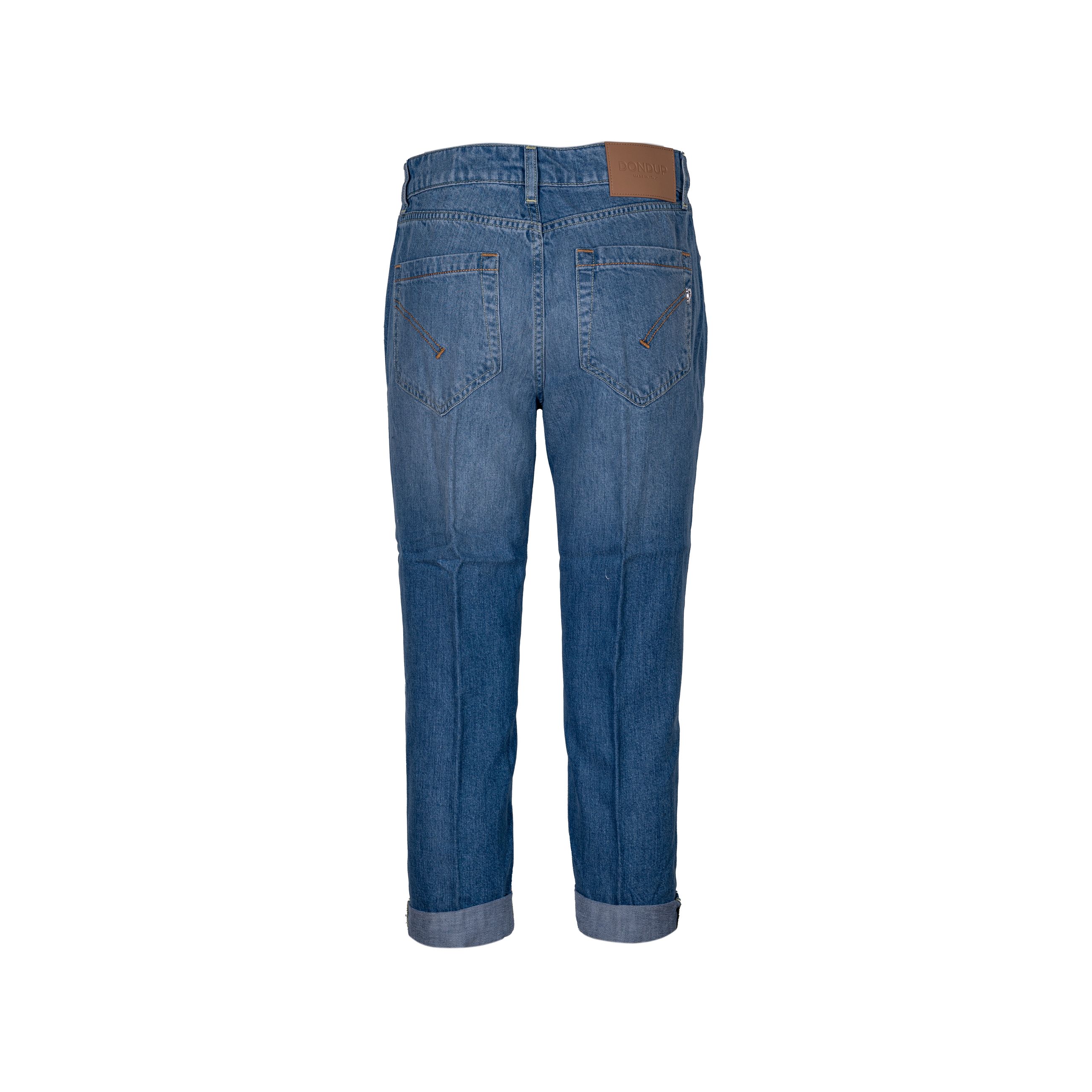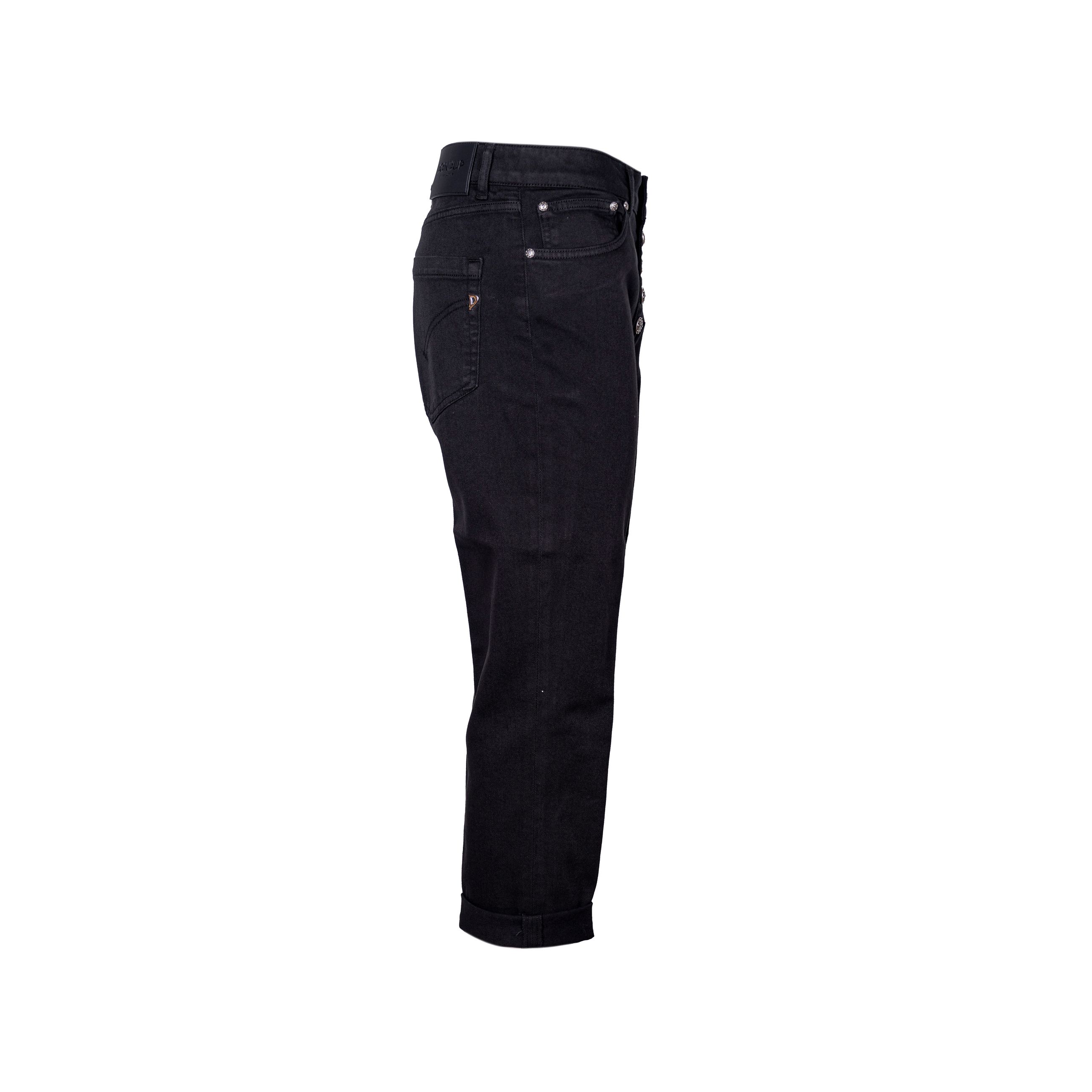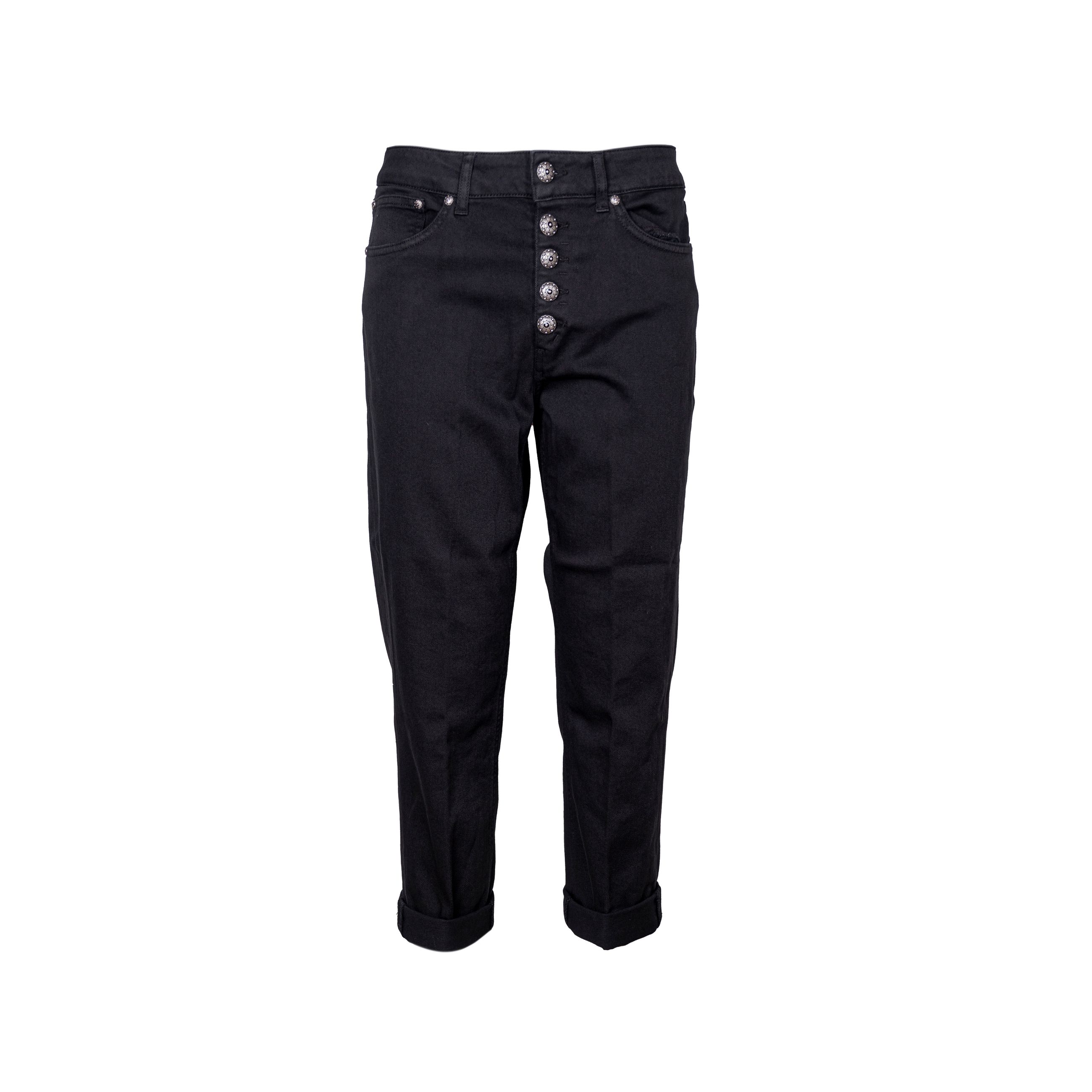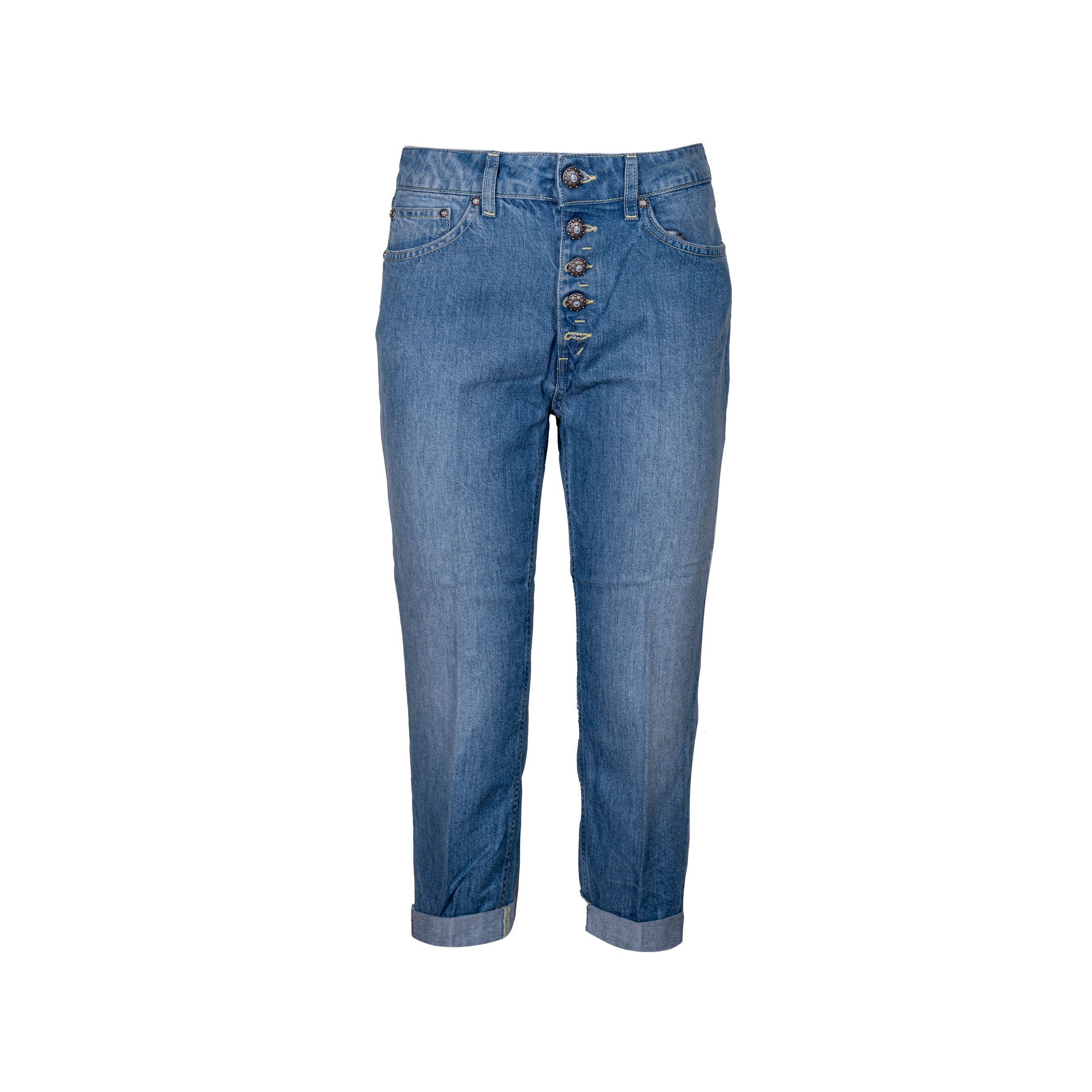 Denim Koons da donna DONDUP. Modello dalla vestibilità Loose, cavallo basso, fondo stretto e corto. Dettaglio bottone e applicazioni gioiello. Made in Italy.
