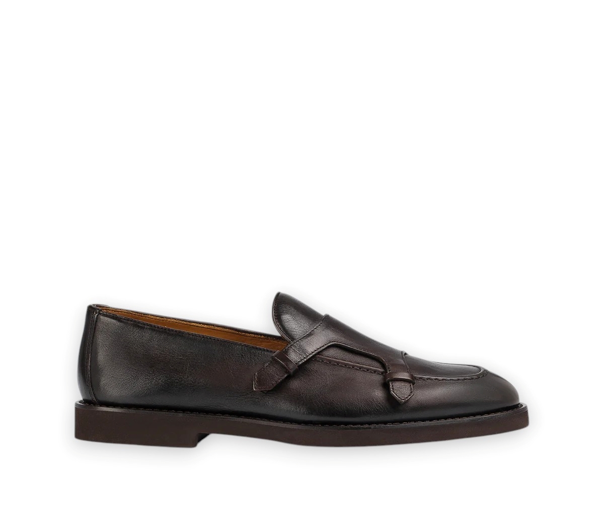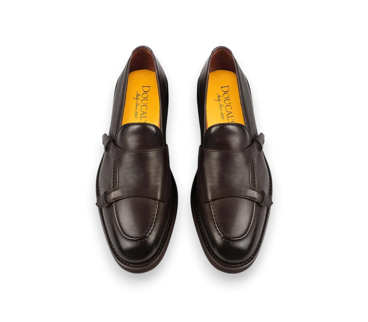 Scarpa da uomo DOUCAL'S. Modello mocassino doppia fibbia con dettaglio "passante" in sostituzione alla classica fibbia. Realizzato in pelle di vitello vegetale lavorato in vasca, cerato a mano, costruzione a sacchetto e cucitura a vaschetta. La lavorazione Blake rende la scarpa resistente e morbida nella calzata. Made in Italy.