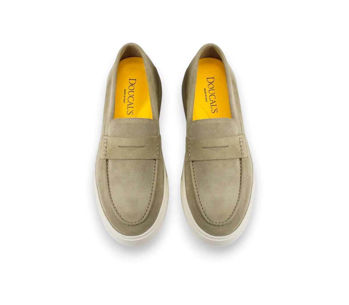 Scarpa da uomo DOUCAL'S. Modello mocassino penny slip-on con soletta in memory foam nell’iconico colore “Golden Cream”. Realizzato in pelle scamosciata con lavorazione Ago e fondo in gomma incollato di eccezionale tenuta.