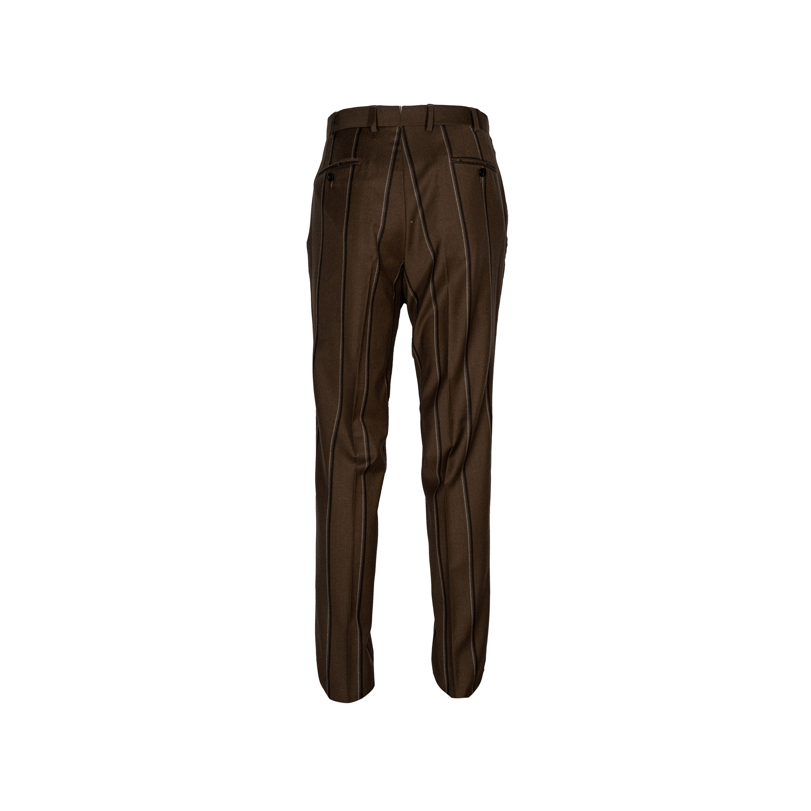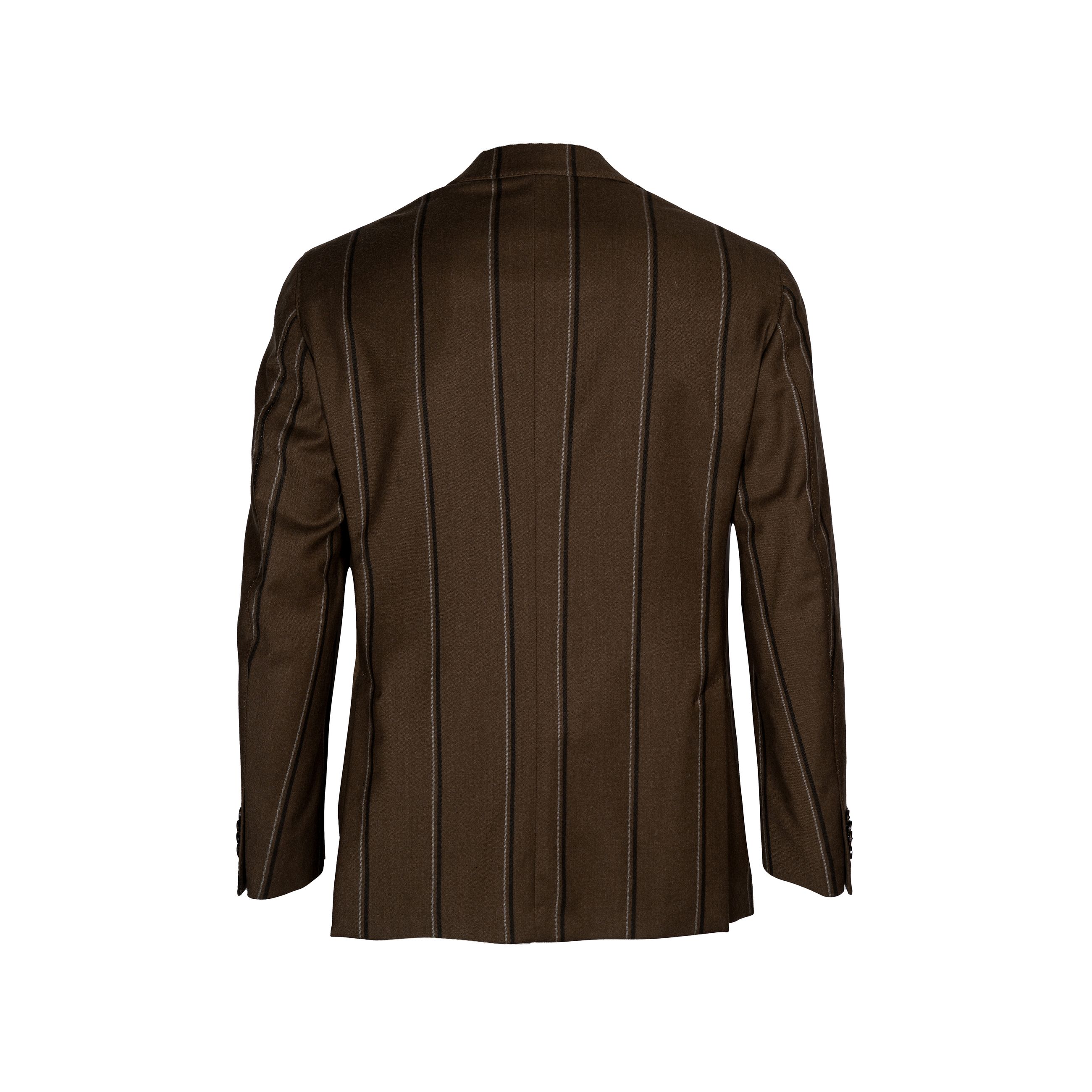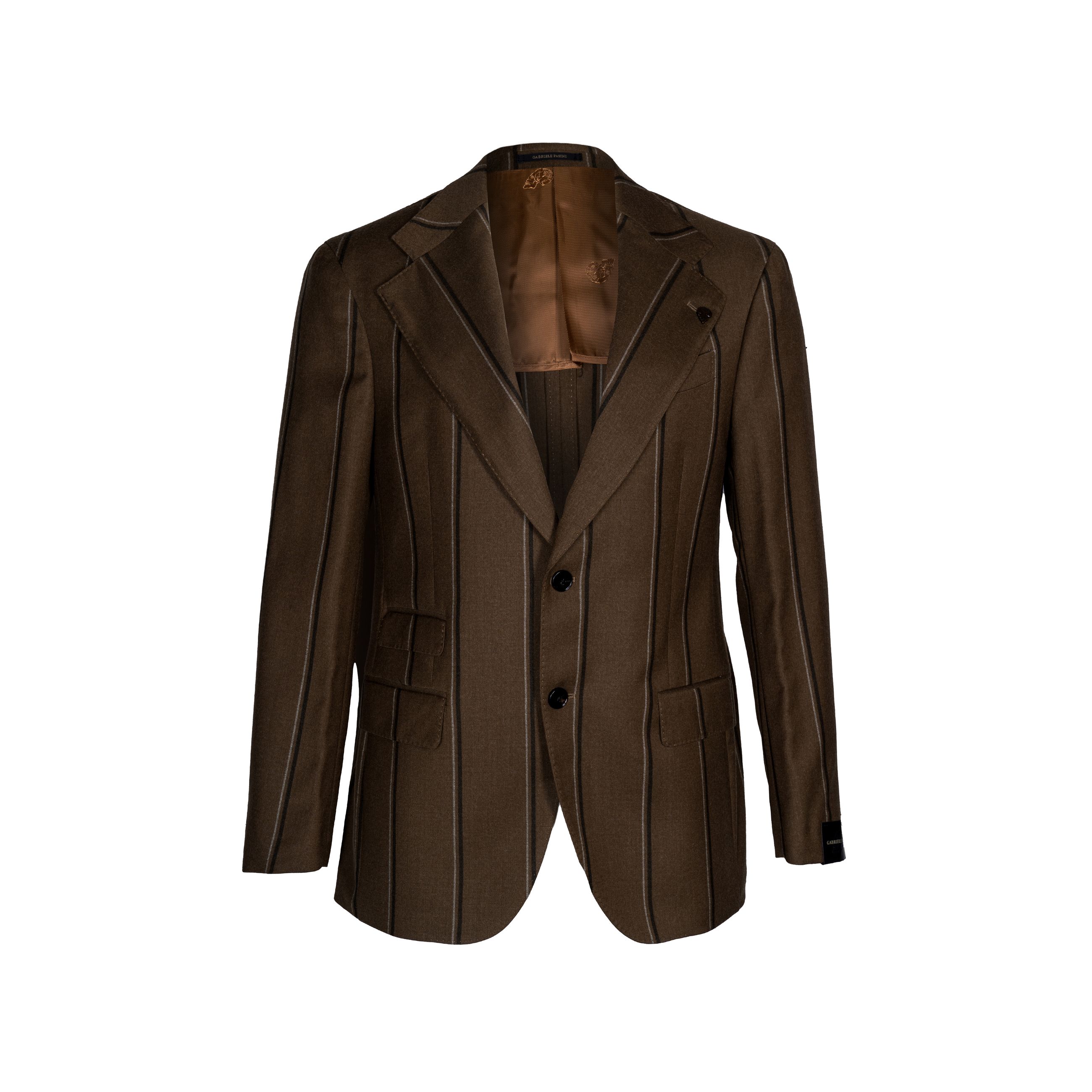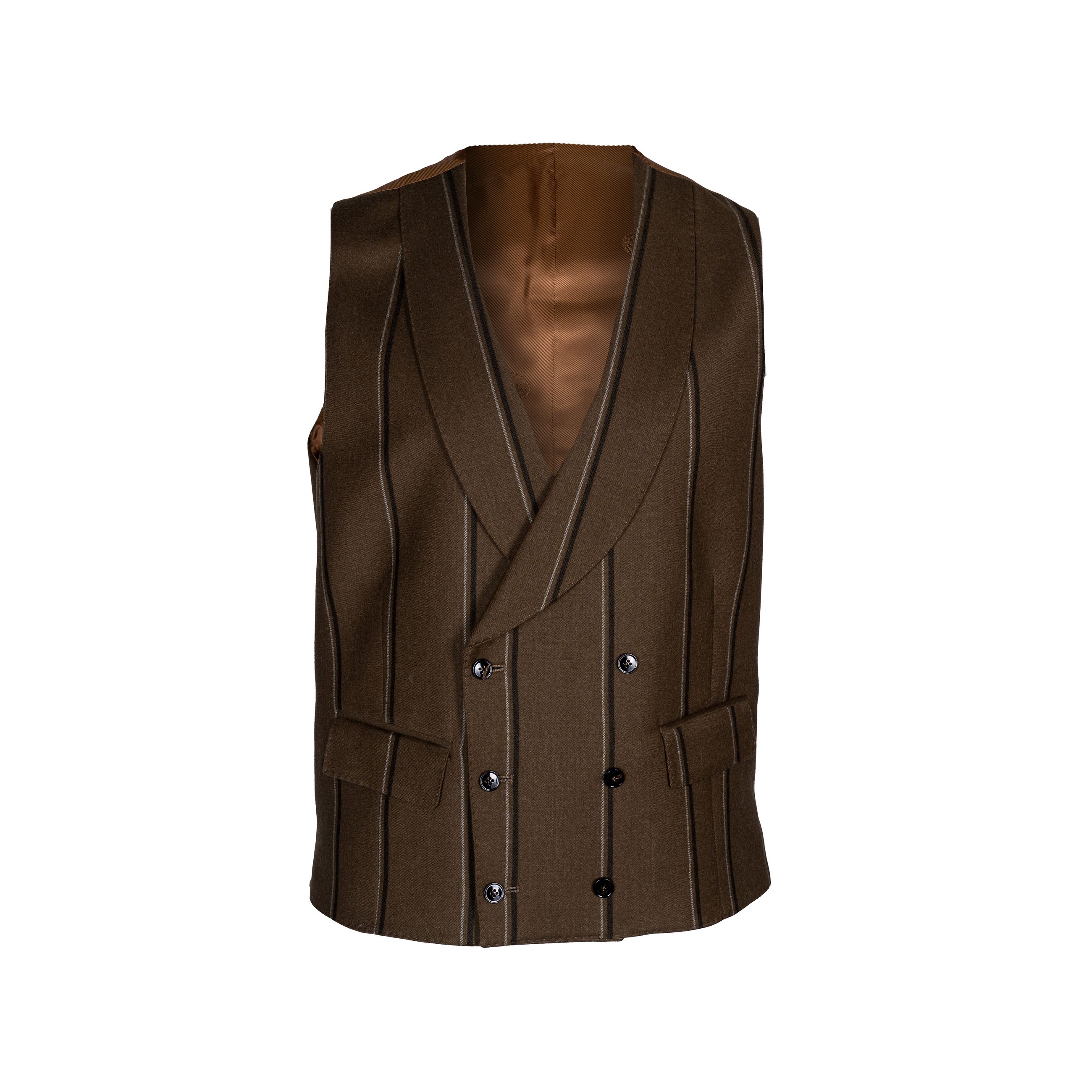 Abito da uomo GABRIELE PASINI. Giacca modello monopetto a due bottoni semi-foderata con rever ampio a specchio, ticket pocket, doppio spacco posteriore. Pantalone classico a ventre piatto con fondo 20. Modello realizzato in lana vergine rasata con motivo rigato classico a passo medio-largo. Bottoni in corno lucido e vestibilità drop 8. L'abito nella taglia 48-50-52 è composto anche dal gilet modello doppiopetto a 6 bottoni con rever sciallato e tasche a pattina. Made in Italy.