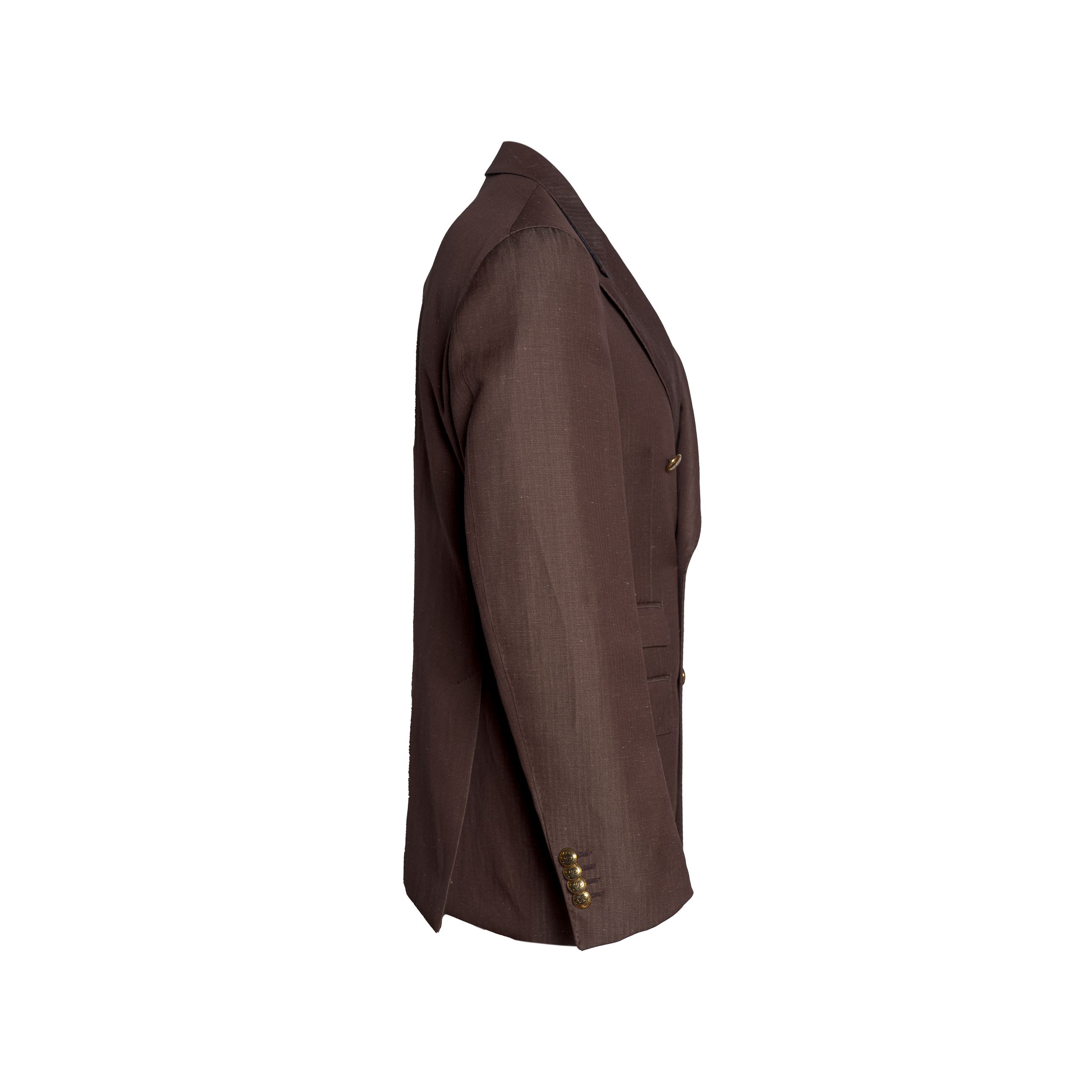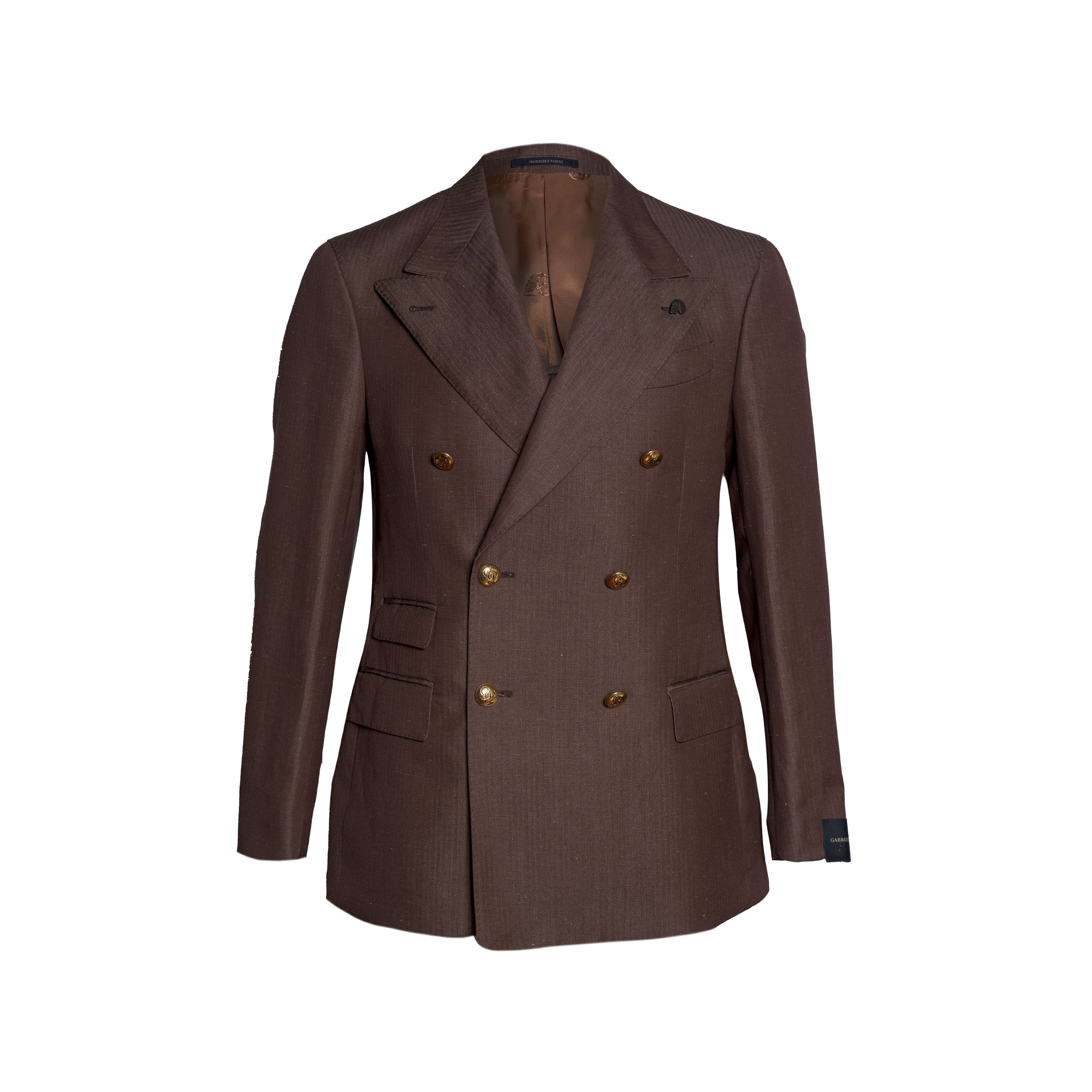 Giacca da uomo GABRIELE PASINI. Modello doppiopetto a 6 bottoni loggati in oro lucido, doppio spacco posteriore, ticket pocket e rever a lancia ampio. Realizzato in un blend di pregiata lana vergine e lino a costruzione Solaro che rende il capo cangiante e di alta qualità. Made in Italy