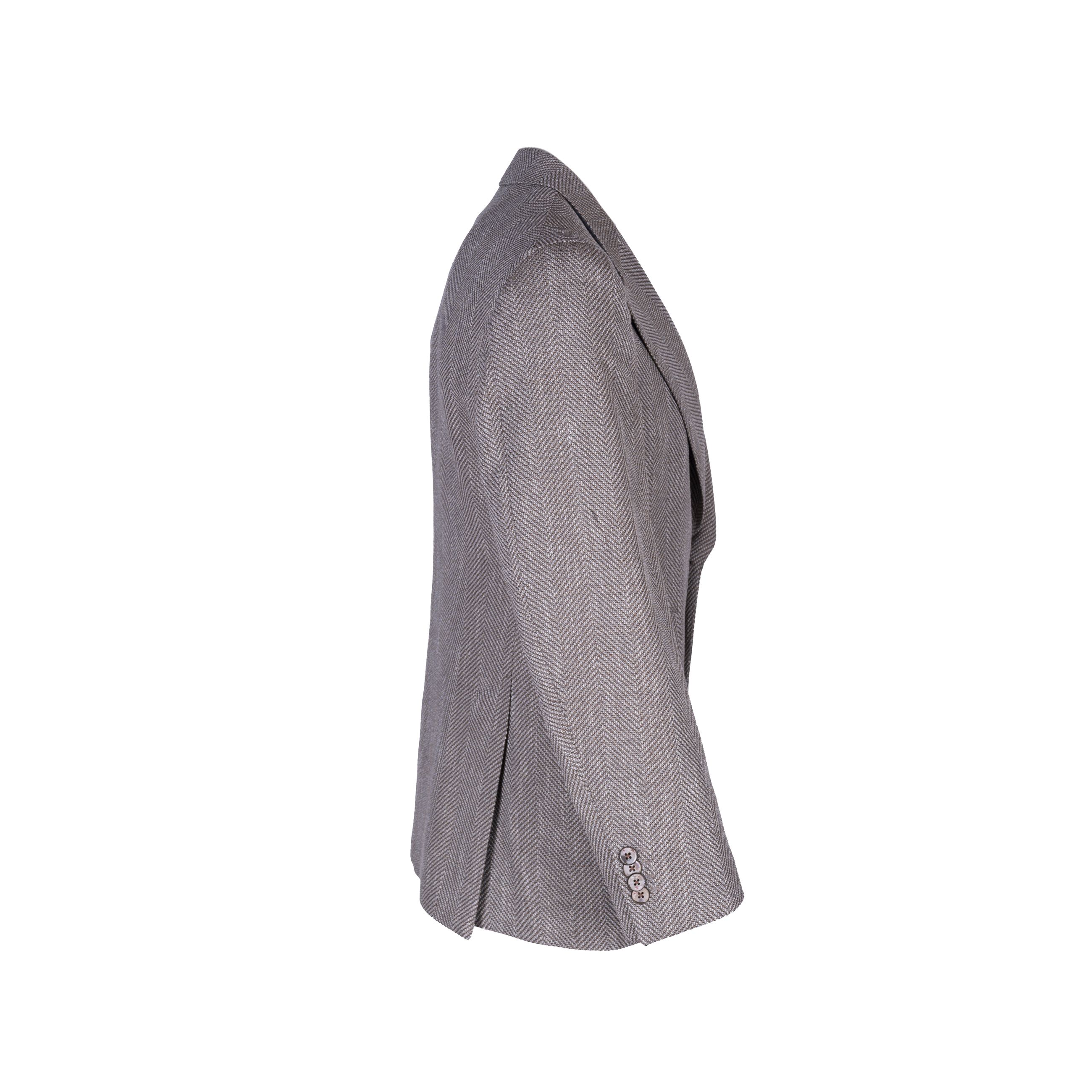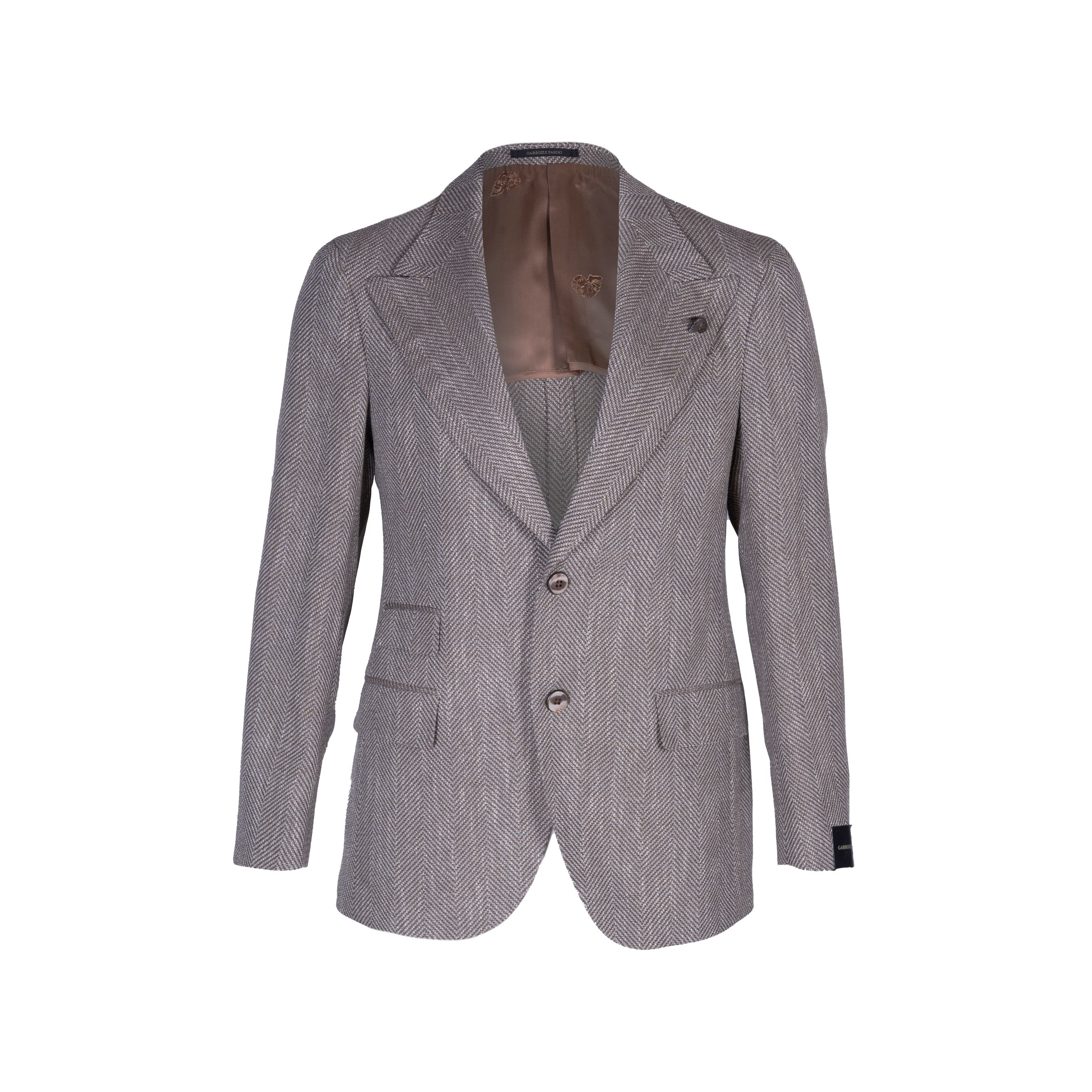 Giacca da uomo GABRIELE PASINI. Modello monopetto due bottoni con rever a lancia ampio, ticket pocket, due spacchi posteriori. Drop S. Realizzato in pregiata lana vergine armaturata con motivo a spina di pesce. Made in Italy.