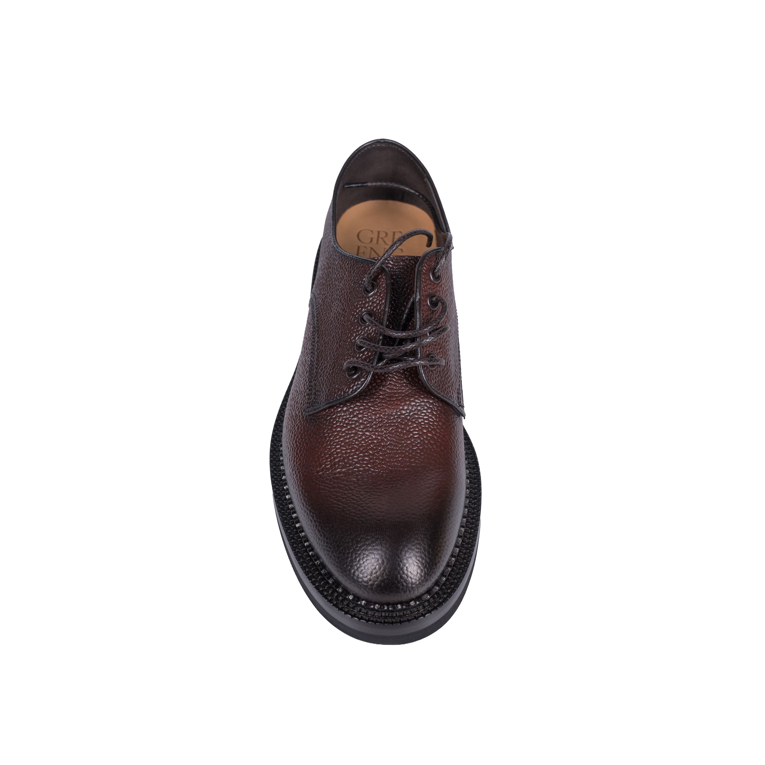 Scarpa da uomo GREEN GEORGE. Modello Derby allacciata, realizzata in pregiata pelle martellata con effetto spazzolato, costruzione con cuciture a vista sul guardolo. Suola in gomma carrarmato. Made in Italy.