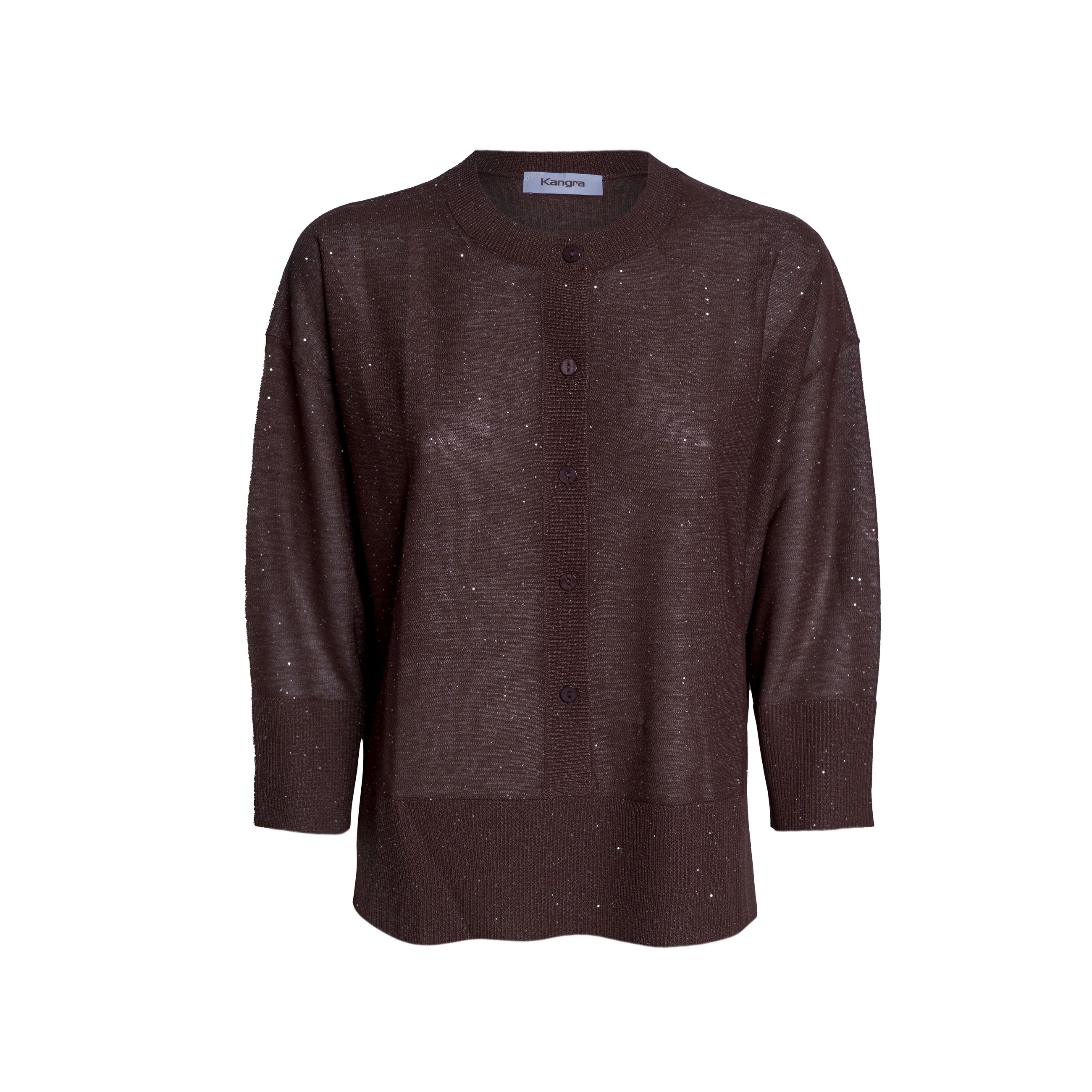 Maglia da donna KANGRA. Modello cardigan serafino a manica 3/4 con spacchettino sul cannettè, chiusura con bottoni, realizzata in viscosa con inserti di micro paillette a finezza 16, Vestibilità regular.