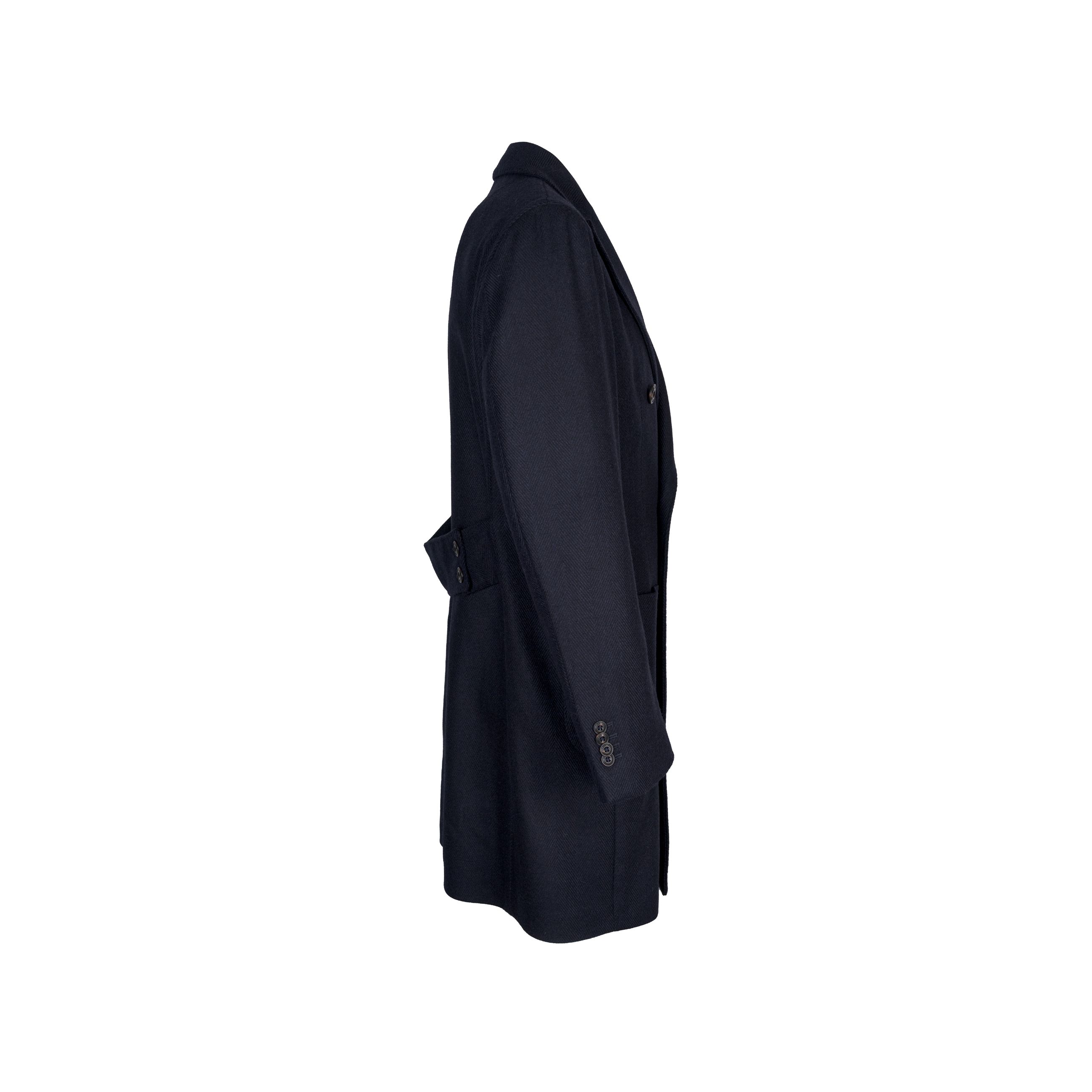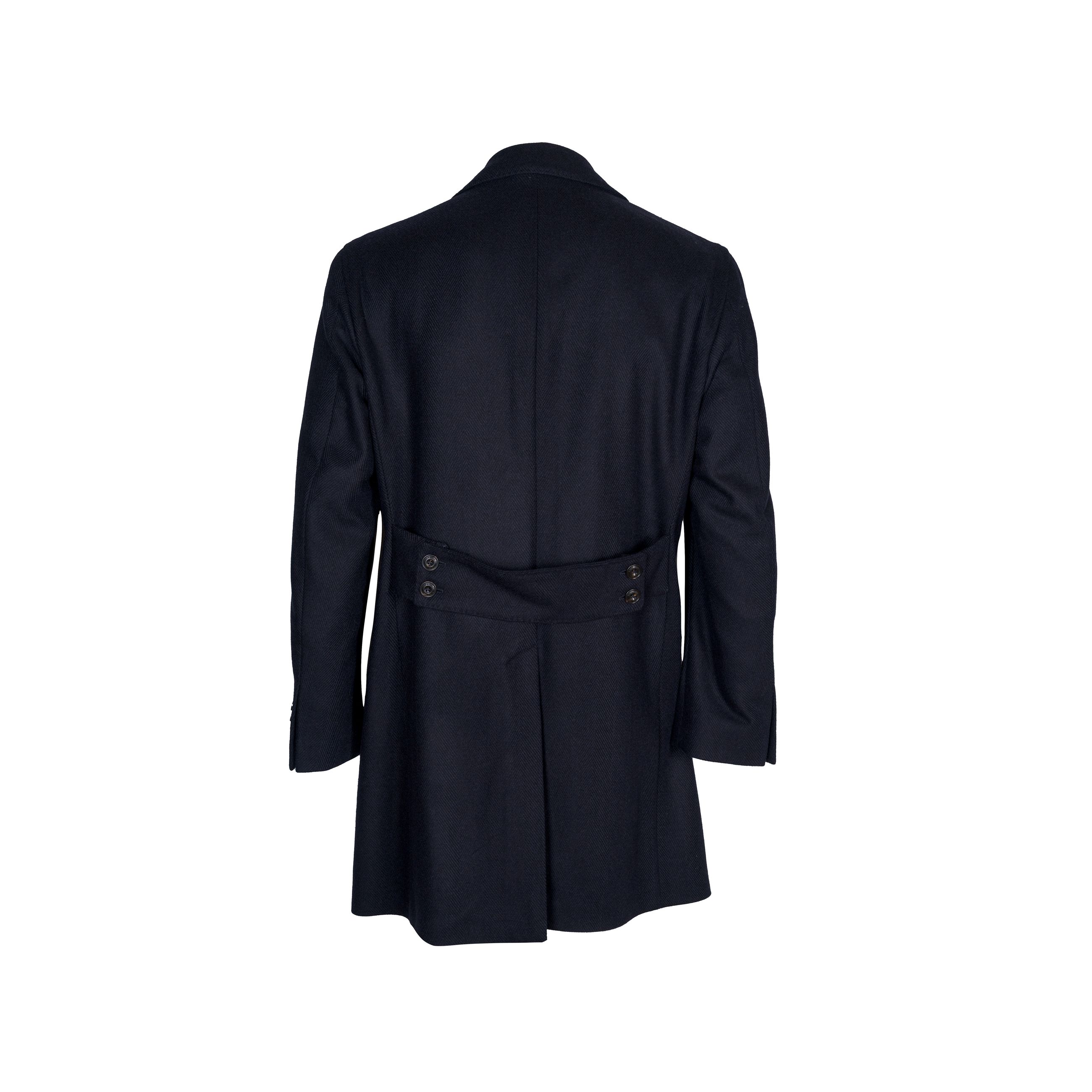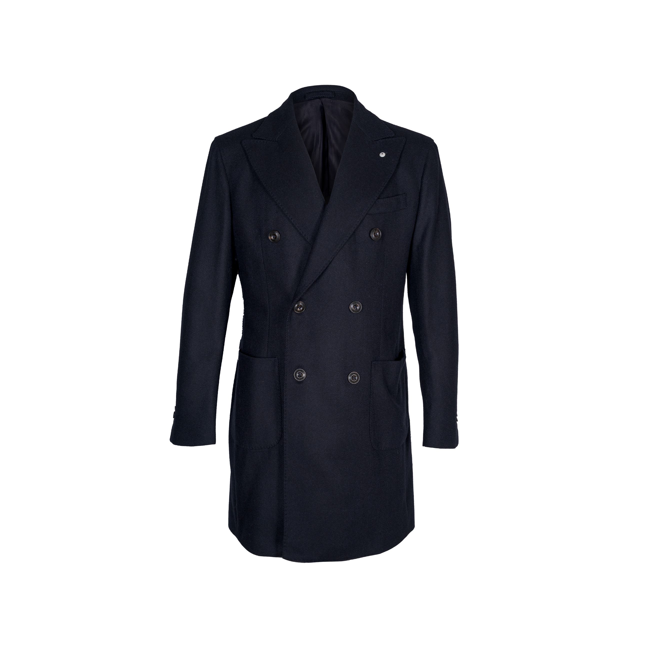Cappotto da uomo L.B.M. 1911. Modello doppio petto semi foderato, con bottoni in corno loggati, con tasche frontali applicate, rever ampio a lancia, spacco centrale posteriore e martingala. Realizzato in pregiata lana e cashmere con motivo spinato. Made in Italy.
