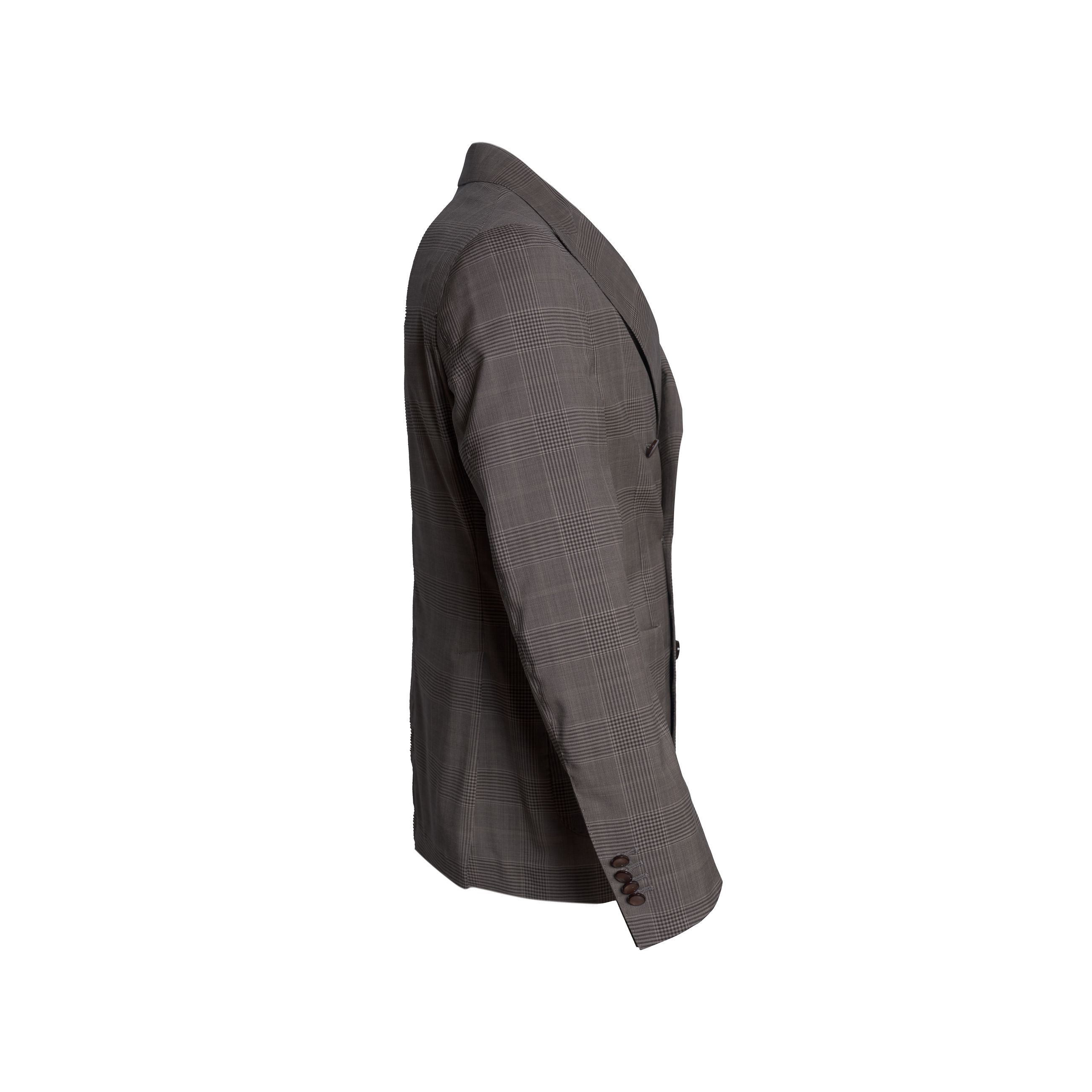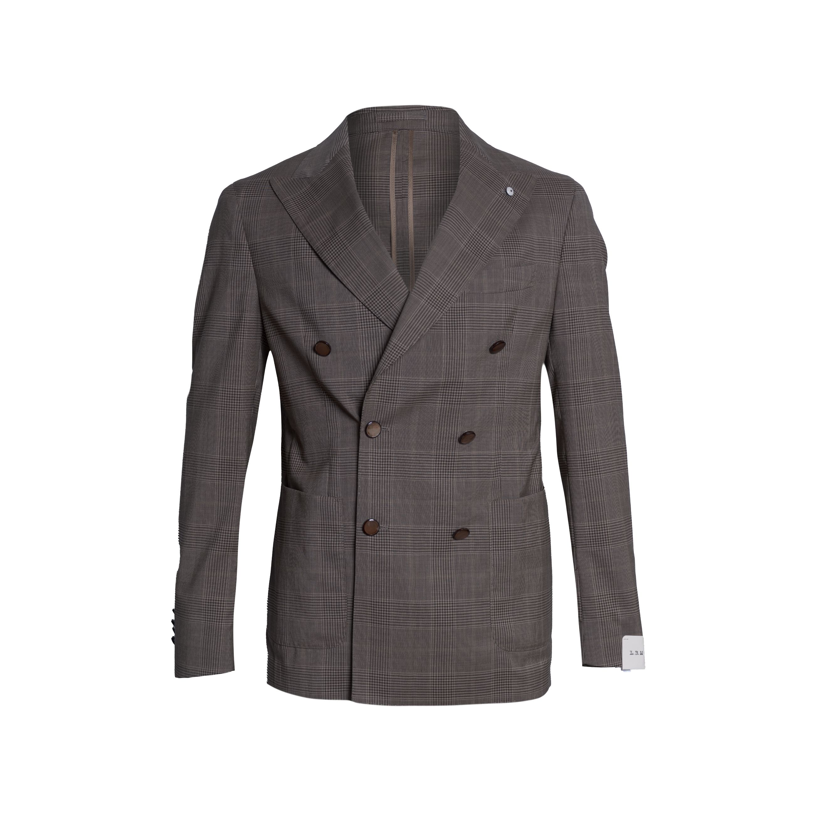 Giacca da uomo L.B.M. 1911. Modello doppiopetto sfoderata, rever ampio a lancia, tasche applicate, doppio spacco posteriore e bottoni in madreperla lucida. Realizzata in pregiata lana vergine a fantasia principe di Galles. Vestibilità slim. Made in Italy.