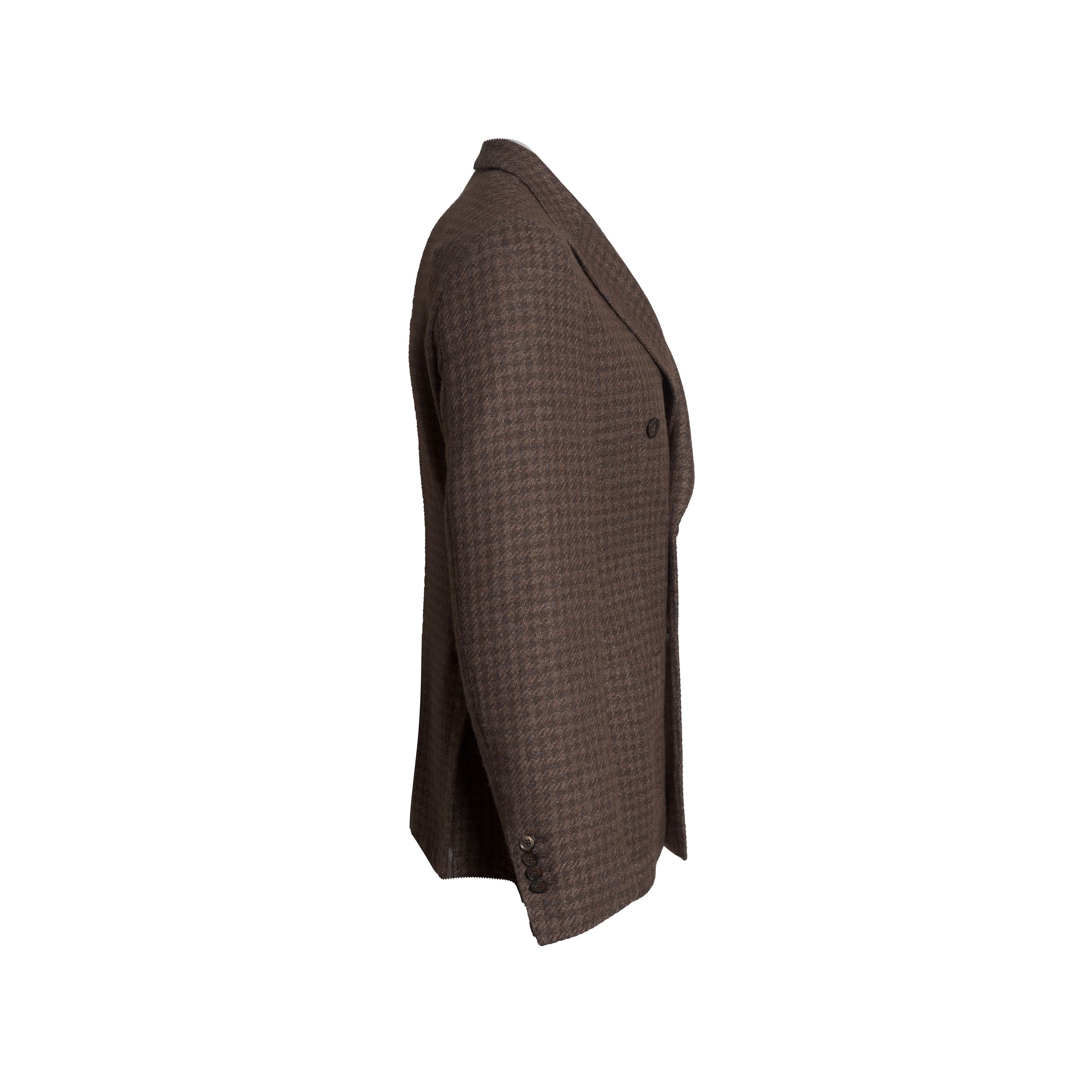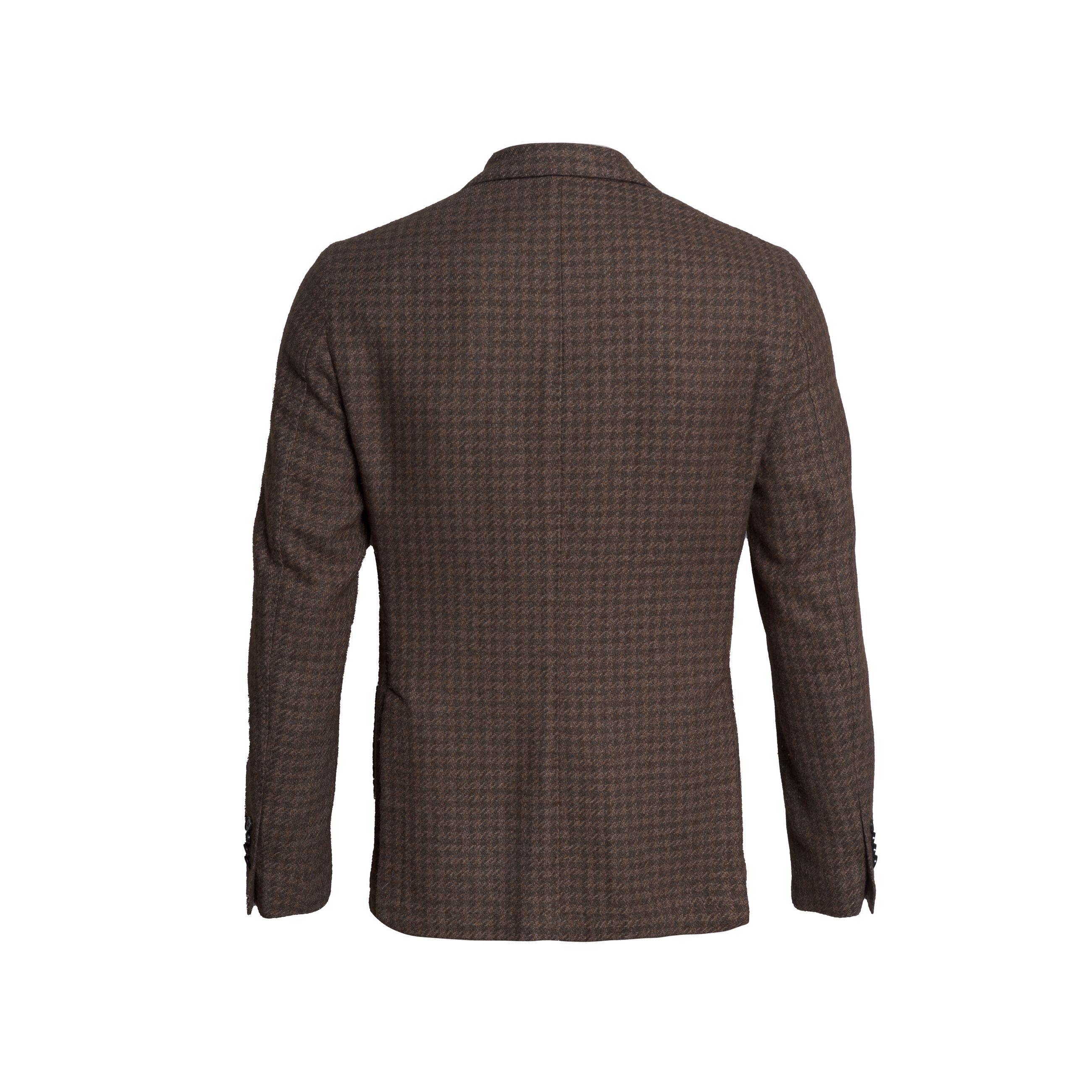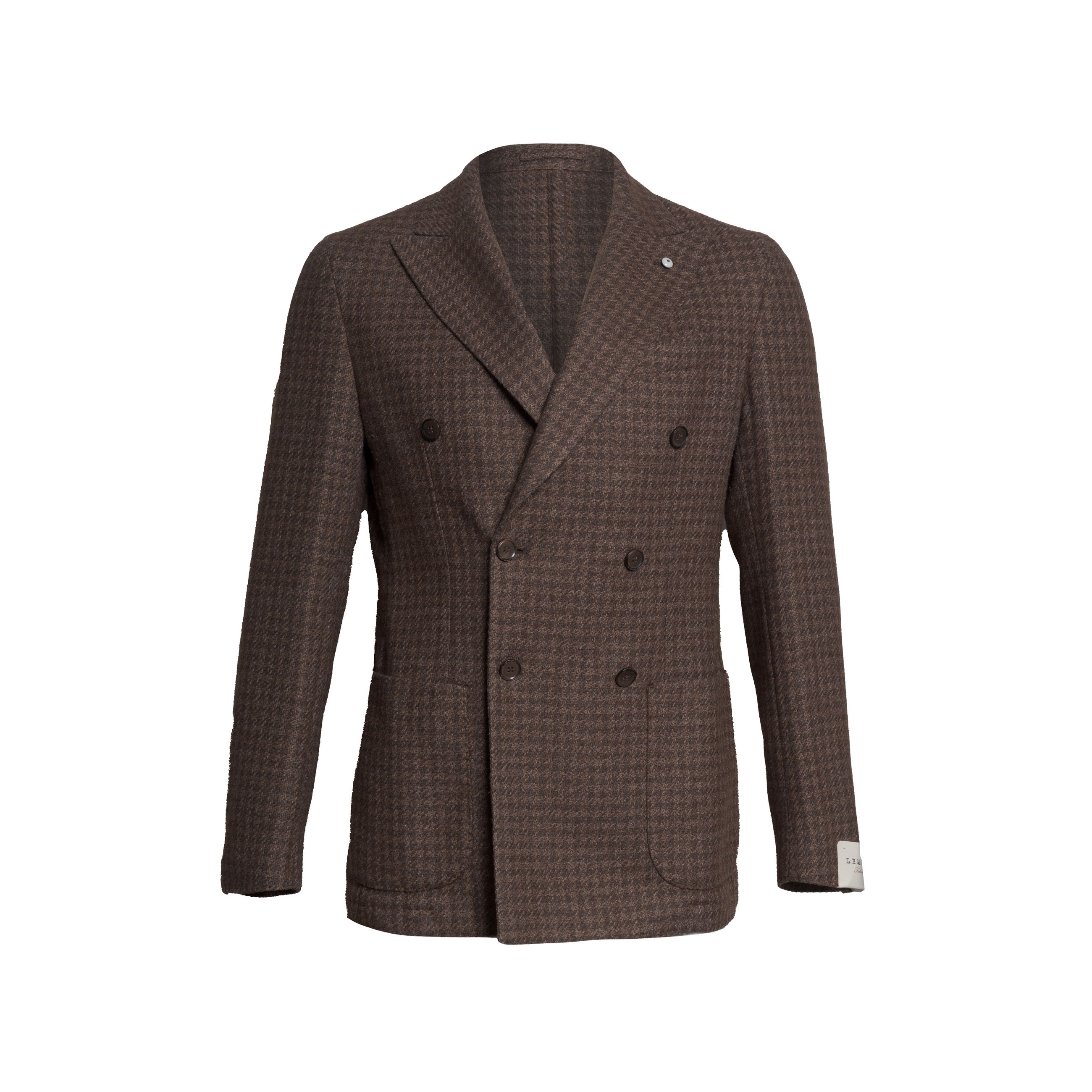 Giacca da uomo L.B.M 1911. Modello doppiopetto sfoderata con rever a lancia, tasca applicata, doppio spacco posteriore e vestibilità regular fit. Giacca realizzata in lana e cotone dalla trama pied de poule Bottoni in corno. Made in Italy.
