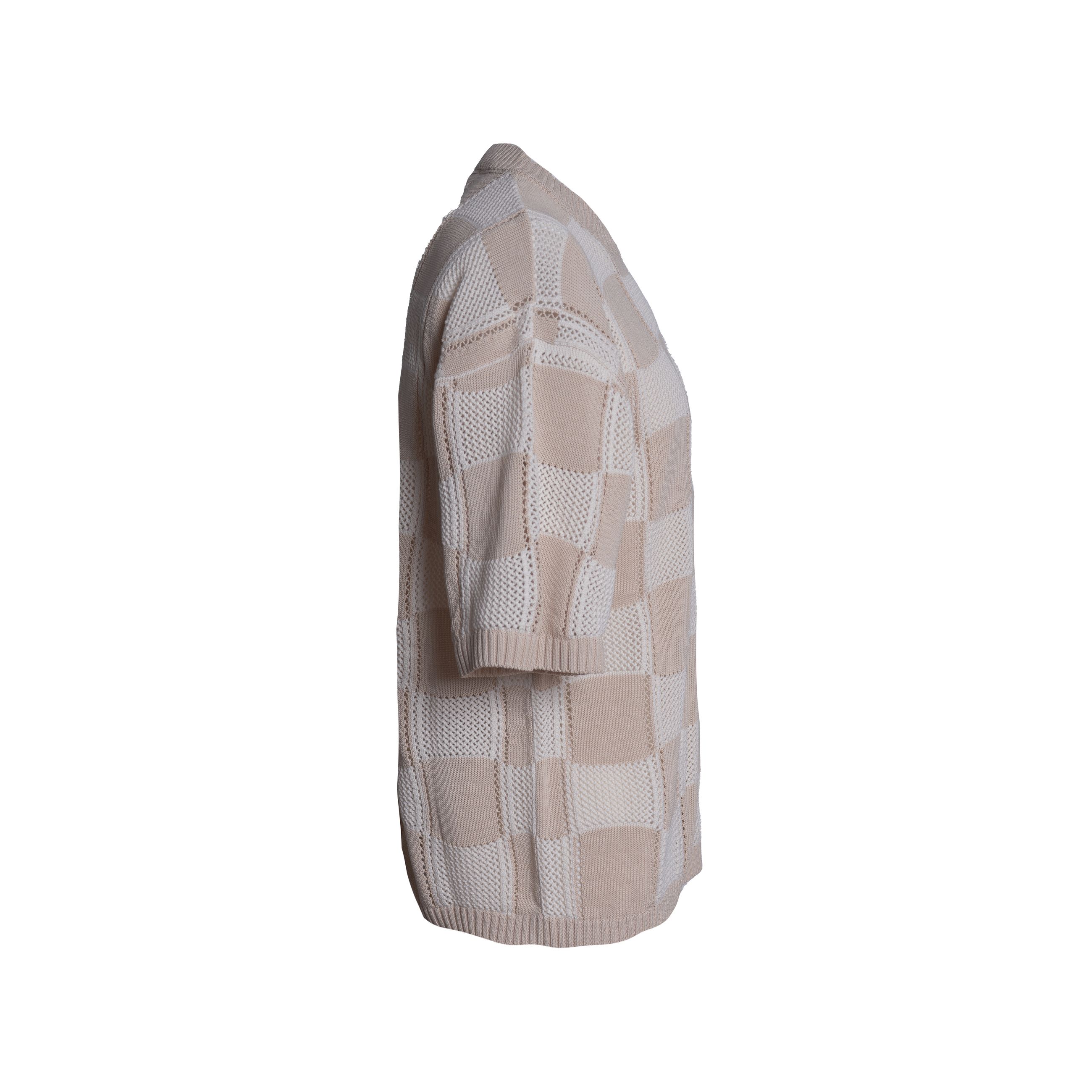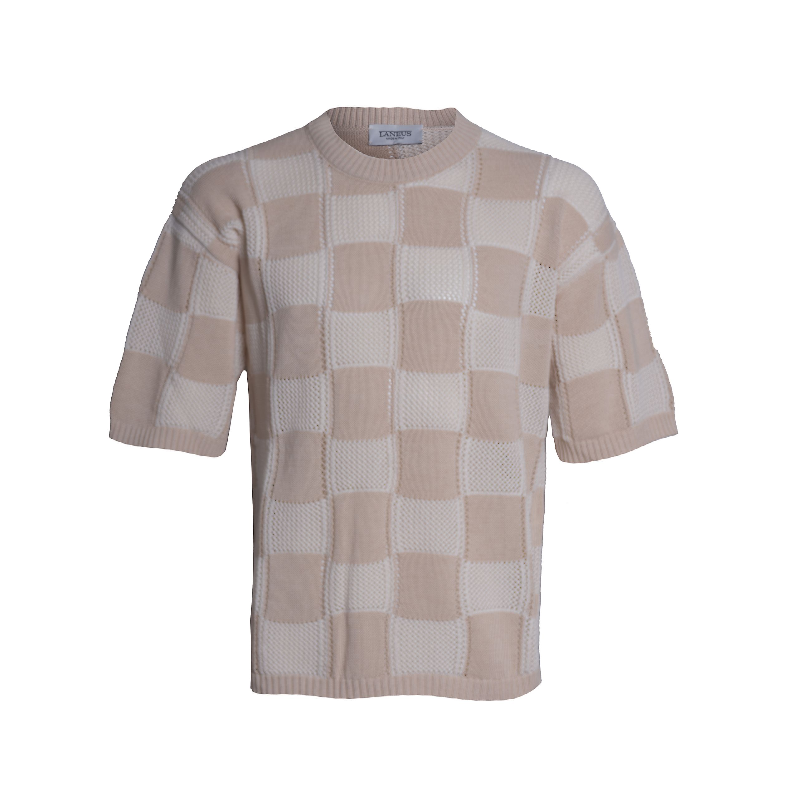 T-shirt da uomo LANEUS. Modello girocollo a manica corta in maglia di cotone jacquard a motivo geometrico, caratterizzata da un raffinato gioco di punti pieni e micro-traforature che dona al capo una leggera trasparenza.