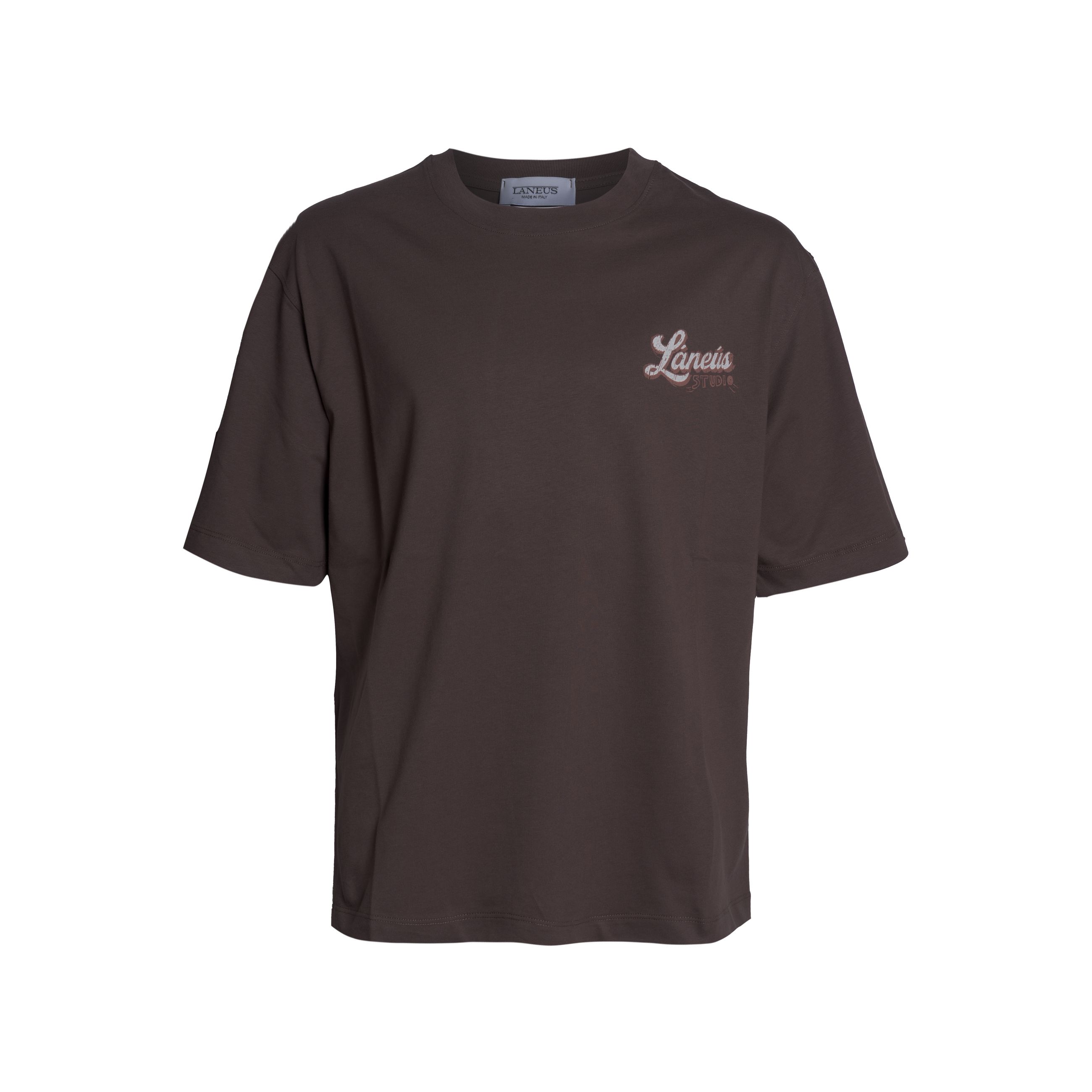 T-shirt da uomo LANEUS. Modello a girocollo manica corta, logo stampato sul petto lato cuore e stampa colorata posteriore lungo tutta la schiena. Realizzata in jersey di cotone. Vestibilità over. Made in Italy.