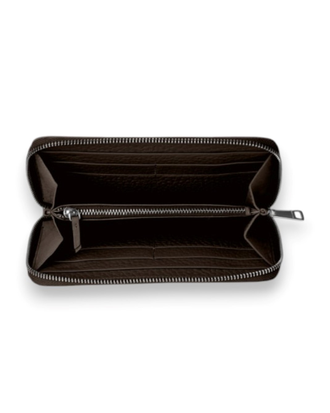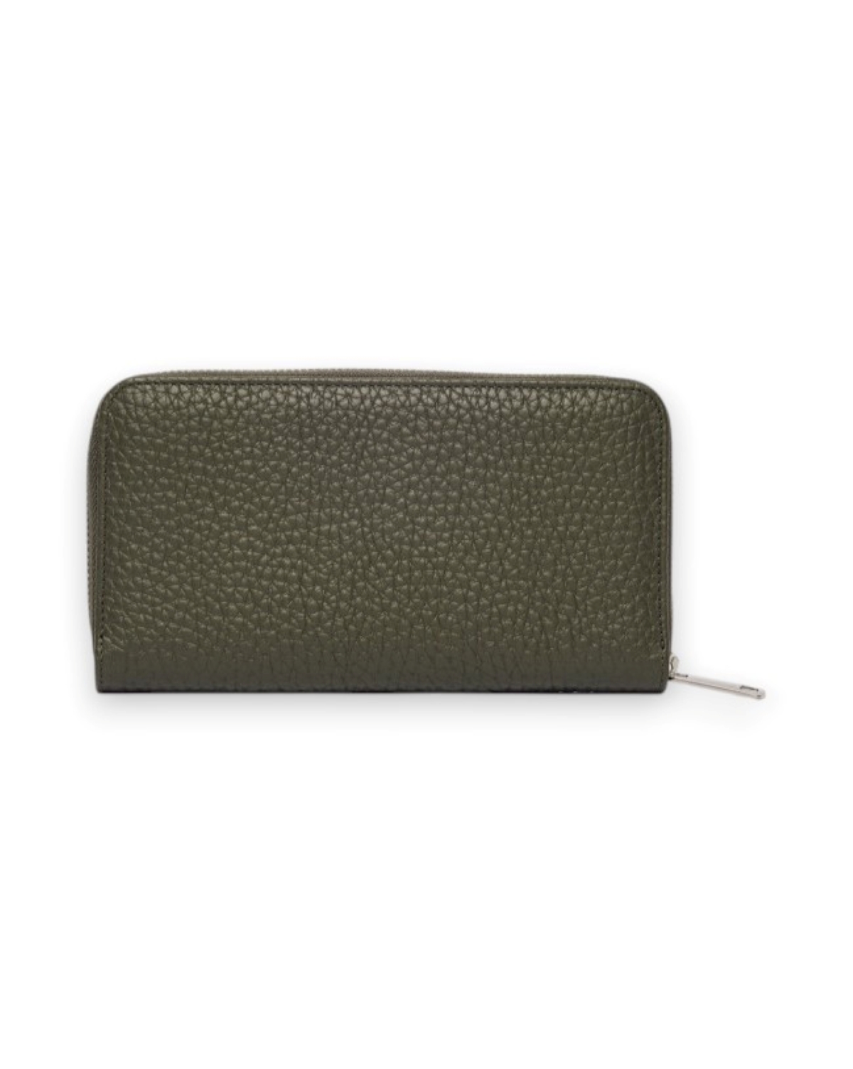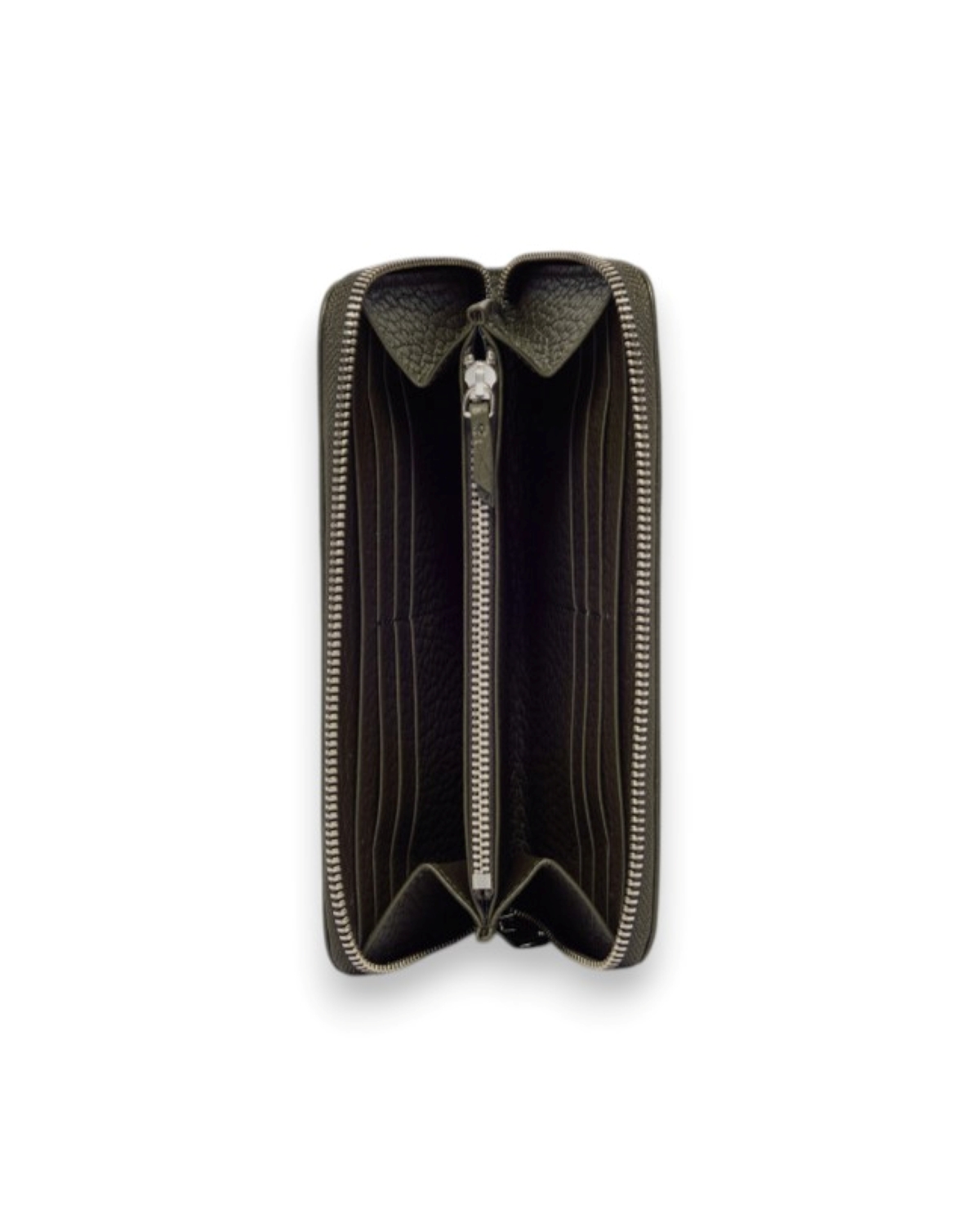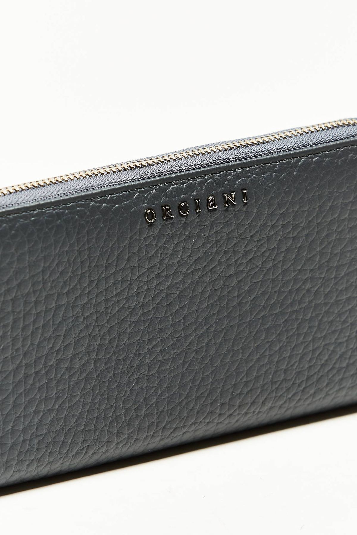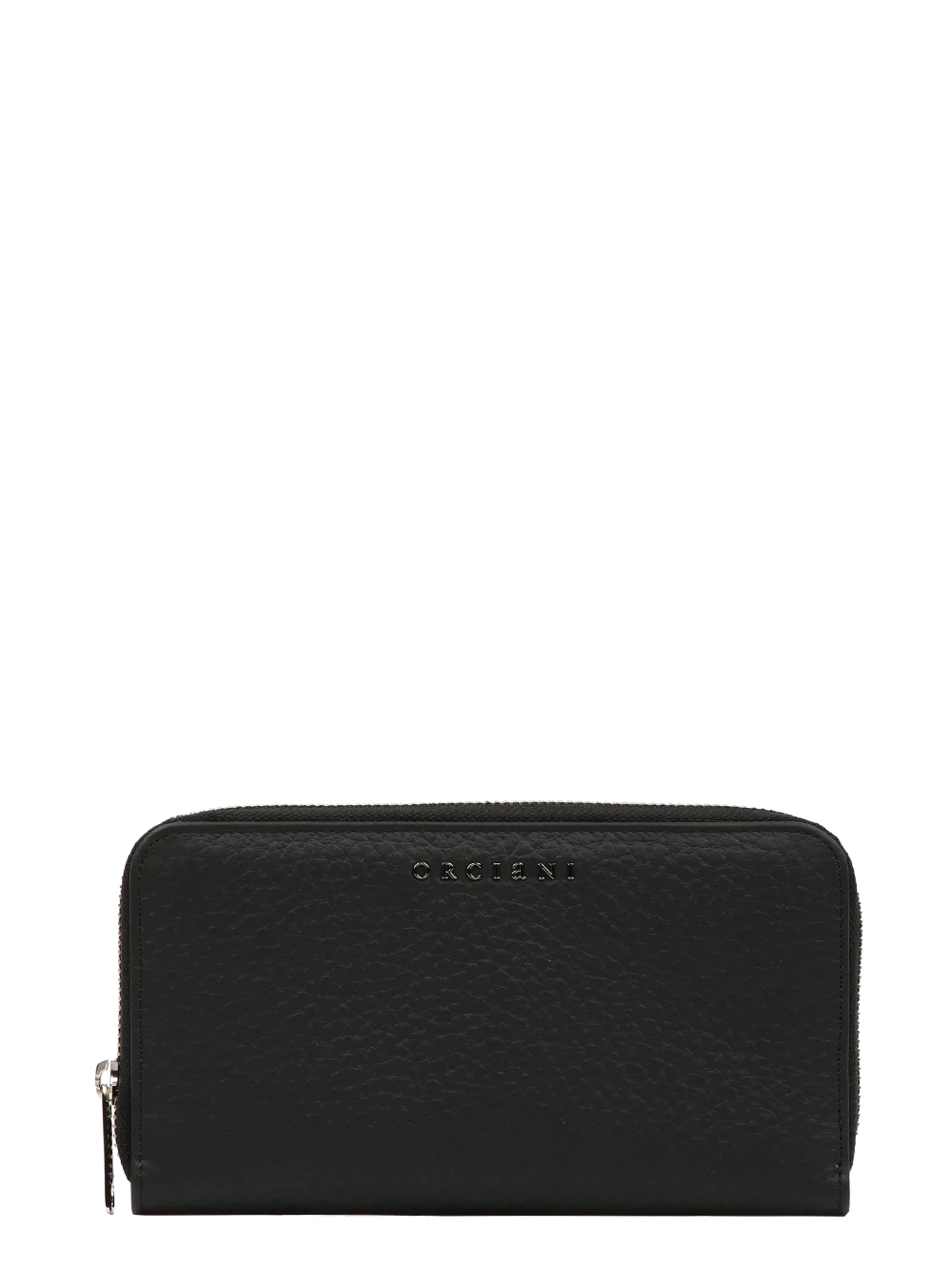 Portafoglio in pelle martellata da donna ORCIANI. Modello con zip. Due scomparti interni per banconote, otto scomparti porta carte, porta monete centrale con zip. 19*10,5*2