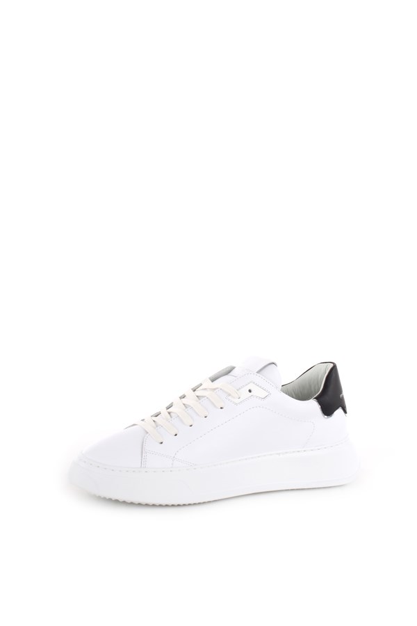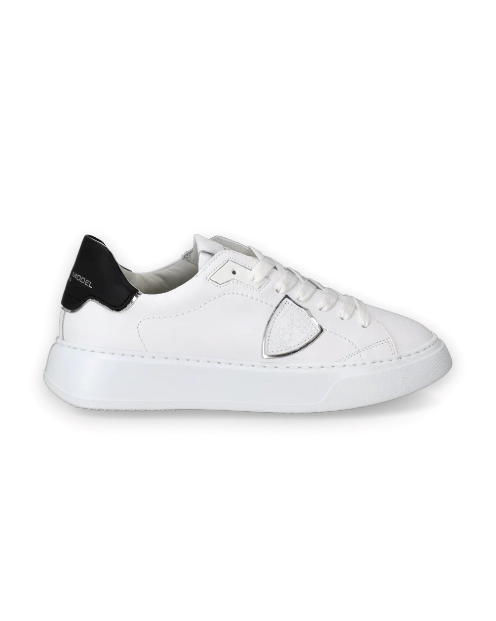 Sneakers da donna PHILIPPE MODEL. Realizzata interamente in pelle bianca con inserto posteriore nero a contrasto. Lacci bianchi cerati in cotone. Suola oversize in gomma. Altezza suola: 4 centimetri.