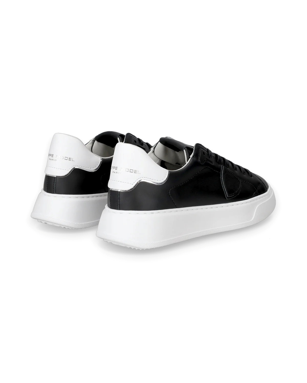 Sneakers da donna PHILIPPE MODEL. Realizzata interamente in pelle nera con inserto posteriore bianco a contrasto. Lacci neri cerati in cotone. Suola oversize in gomma. Altezza suola: 4 centimetri. Prodotto in Italia.