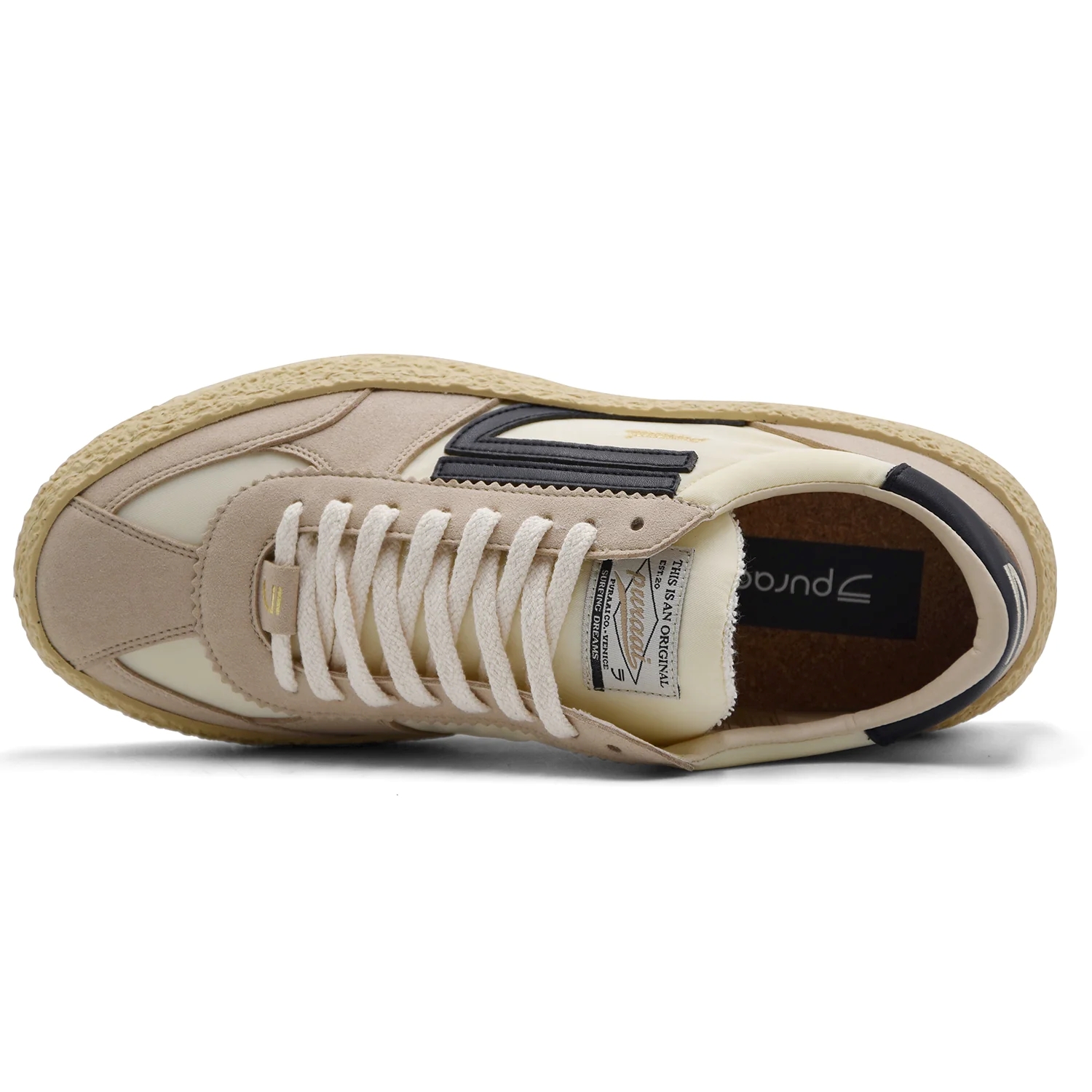 Sneakers unisex PURAAI. Modello Vintage che si distingue per il mix materico in suede vegana e tessuto tecnico riciclato. Iconica suola in gomma effetto crépe irregolare, soletta interna in sughero.