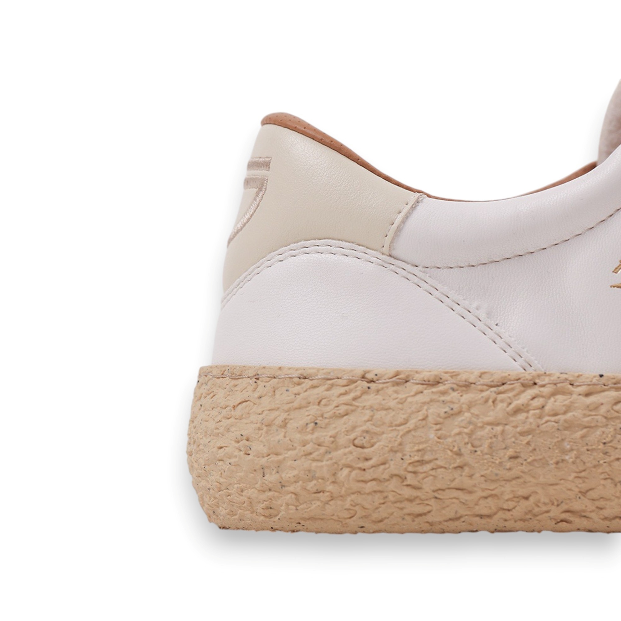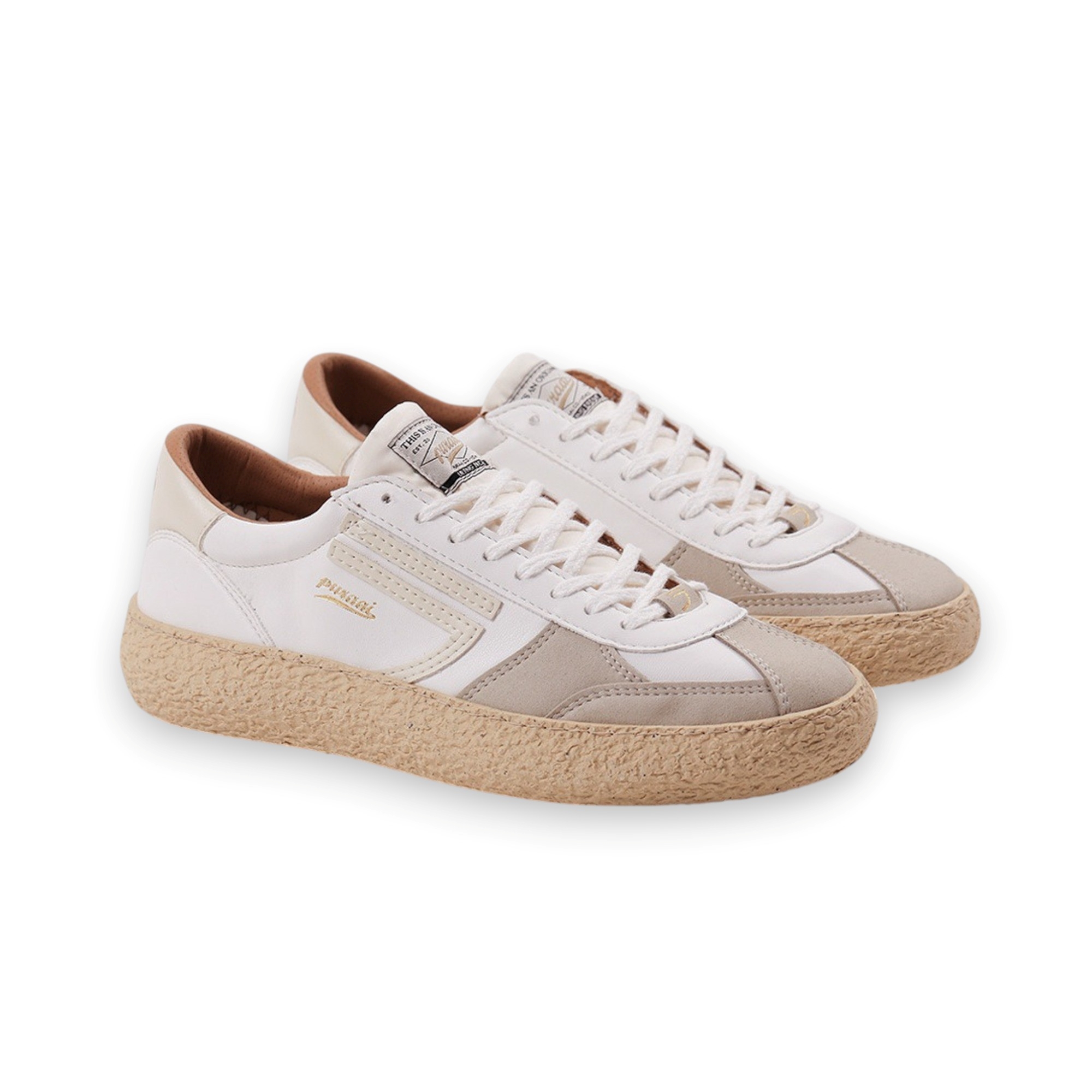 Sneakers unisex PURAAI. Modello Vintage che si distingue per il mix materico in suede e pelle soft vegana. Iconica suola in gomma effetto crépe irregolare, soletta interna in sughero. Made in Italy.