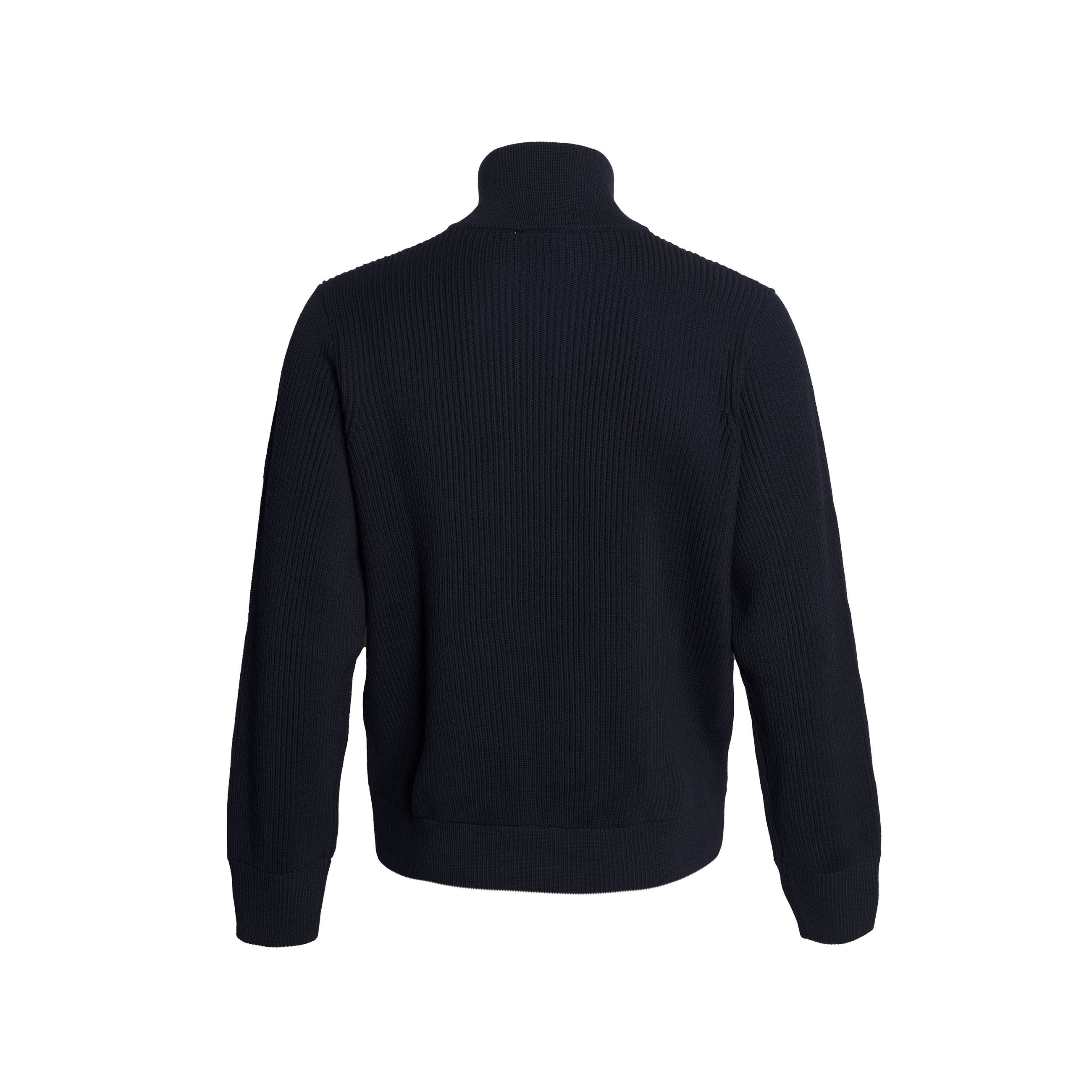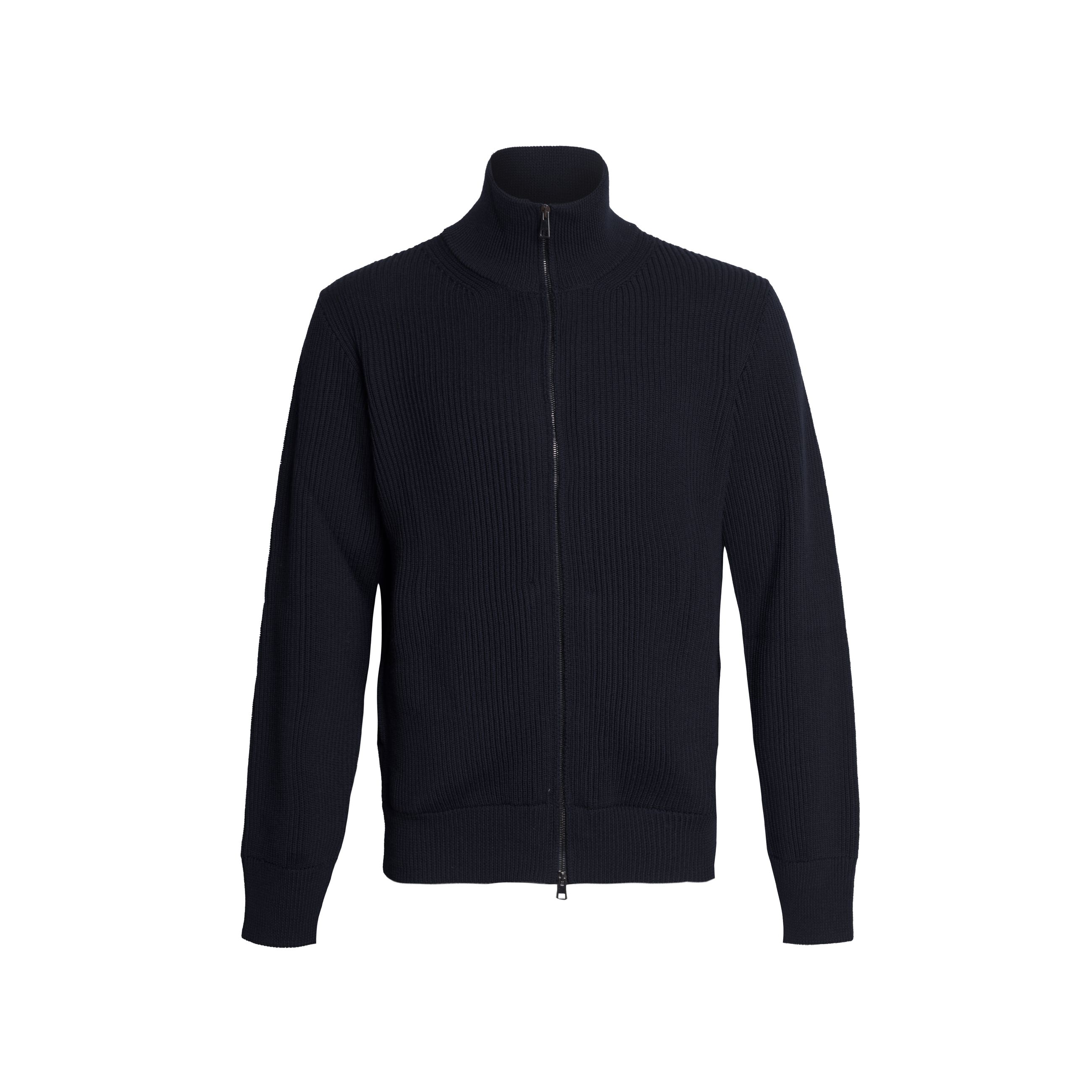Maglia da uomo ROBERTO COLLINA. Modello cardigan full zip con doppio cursore, manica lunga, tasche laterali a filo e collo alto. Realizzato in pregiata lana merinos extrafine a costa inglese. Vestibilità regular.