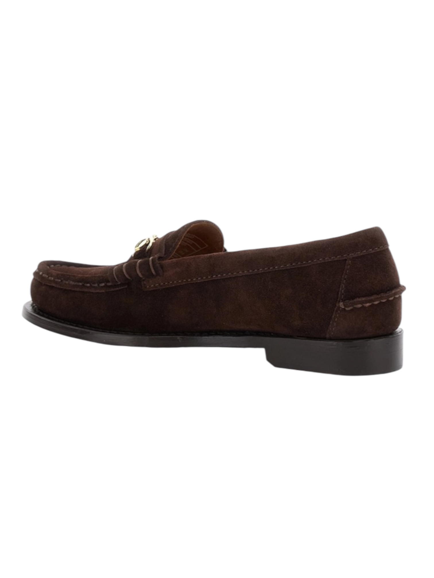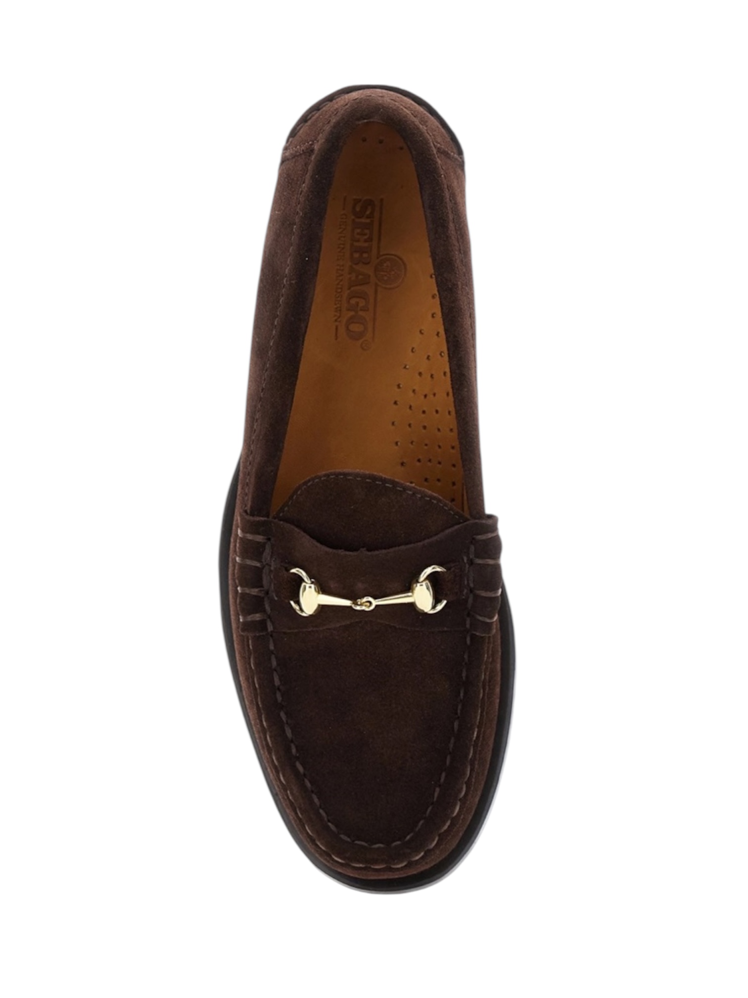 Mocassino da donna SEBAGO. Modello Joe Modena realizzato in pregiata pelle scamosciata con morsetto decorativo in metallo e vaschetta cucita a mano. Si caratterizza per la suola in cuoio e il tacco modellato metà in gomma e metà cuoio. Calzata regolare.
