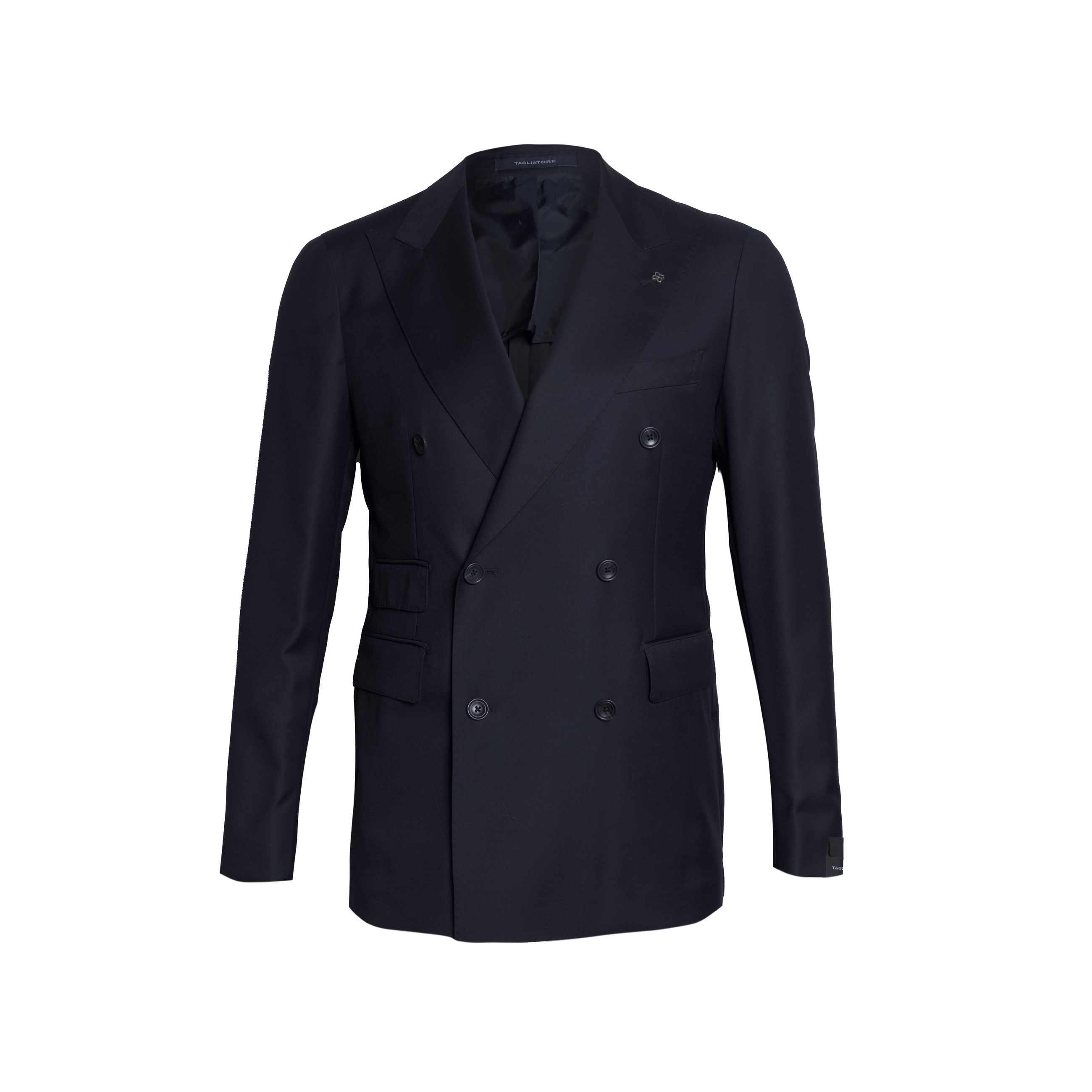 Abito da uomo TAGLIATORE. Modello giacca doppiopetto rever ampio a lancia, ticket pocket, tasche a pattina, doppio spacco posteriore. Pantalone classico con pences, watch pocket e fondo 18. Abito realizzato in pregiata lana vergine Super 110's, un tessuto estremamente pregiato che unisce leggerezza e morbidezza.
