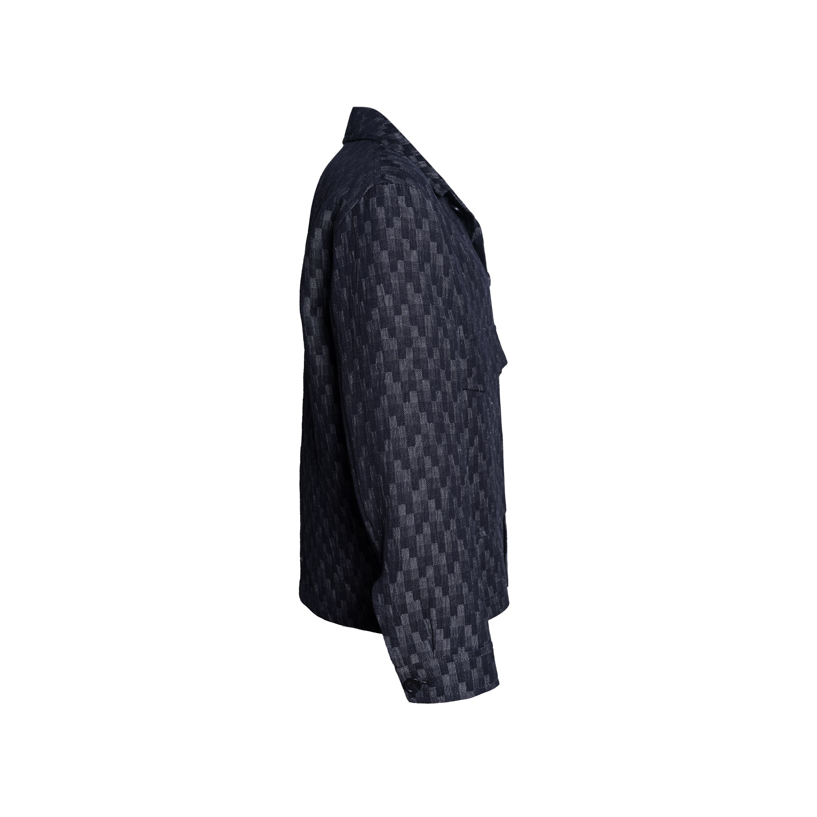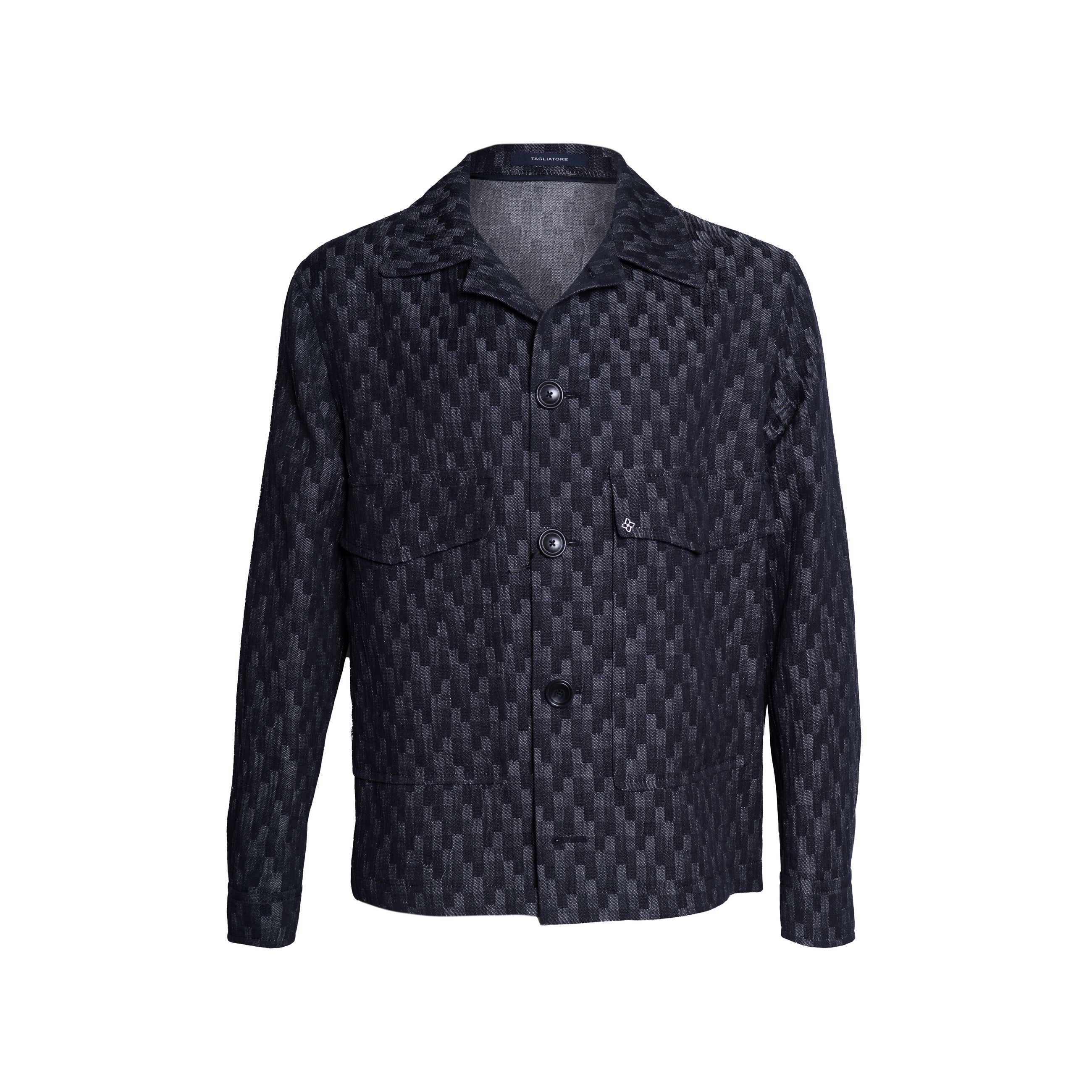 Giubbotto da uomo TAGLIATORE. Modello overshirt sfoderata con tasconi frontali applicati, chiusura a bottoni, colletto classico a camicia, taglio squadrato. Realizzata in un blend di lino e cotone con una trama tridimensionale e un gioco di chiaroscuri che crea un disegno geometrico. Vestibilità regular. Made in Italy.