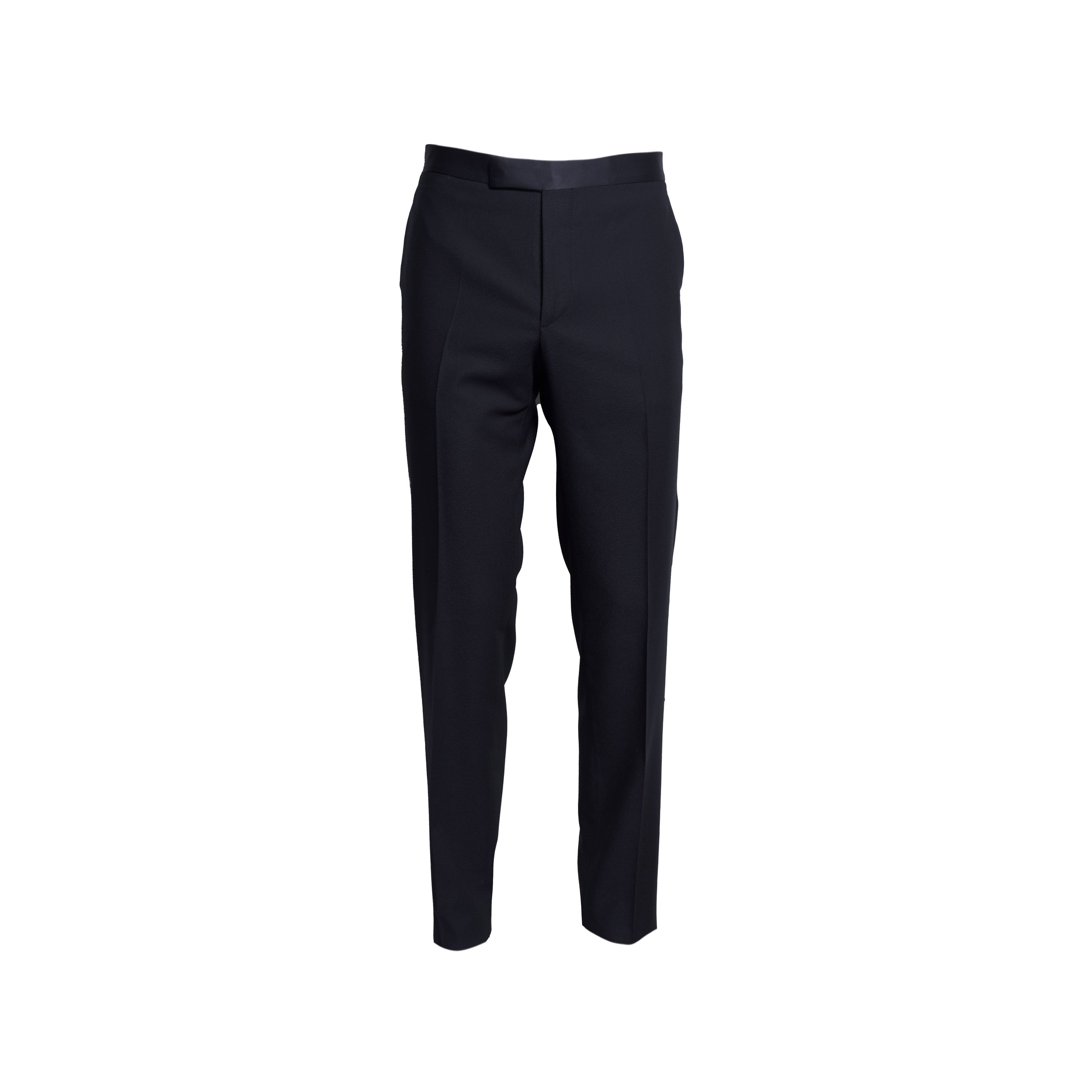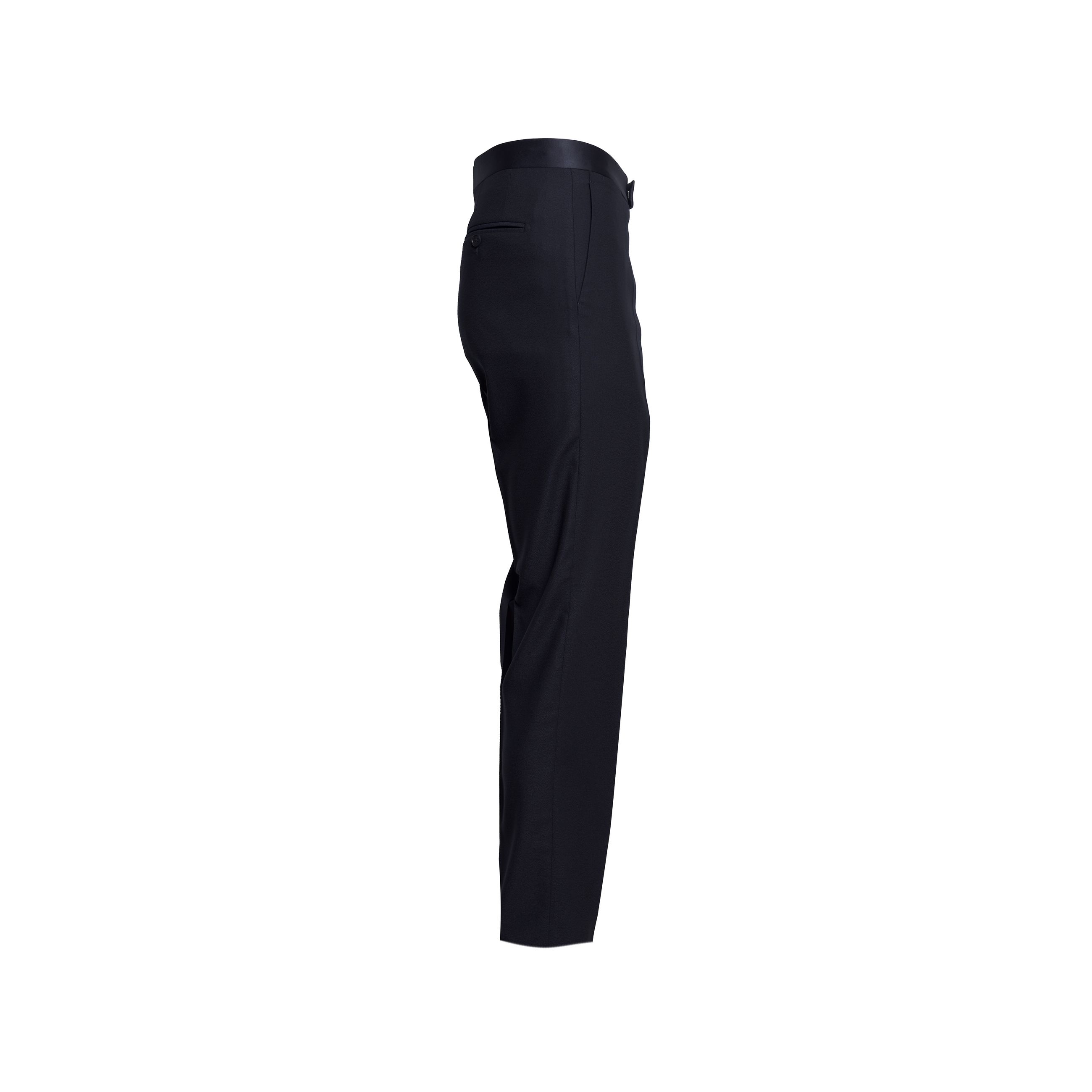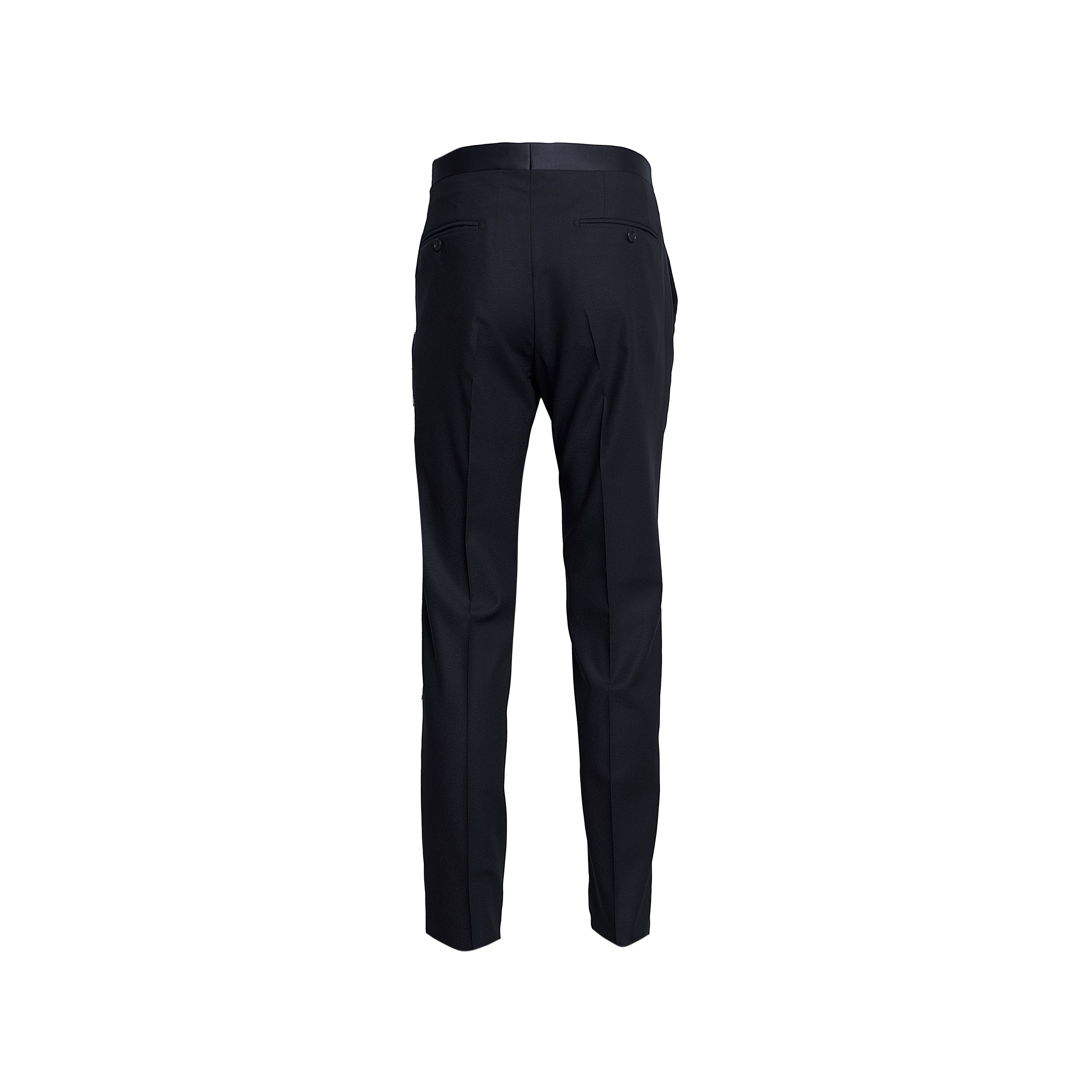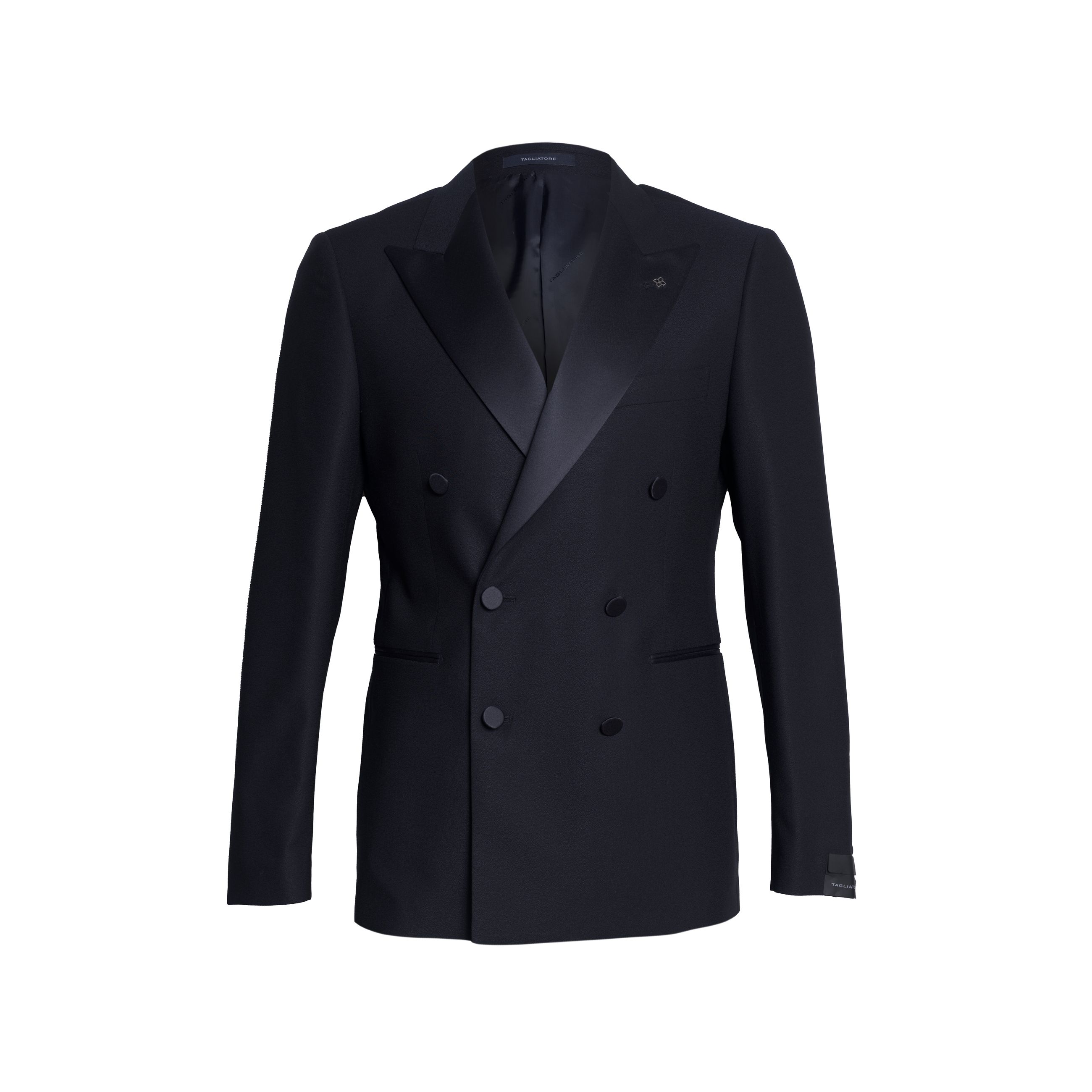 Abito da uomo TAGLIATORE. Modello smoking doppiopetto, spacco singolo posteriore, rever a lancia e bottoni rivestiti in raso. Pantalone classico ventre piatto con fascione vita in raso e fondo 19. Realizzato in pregiata lana vergine super 110's sinonimo di comfort e raffinatezza. Made in Italy.